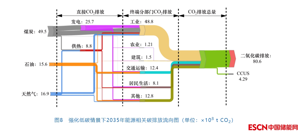 從能源相關(guān)碳排放的流向來(lái)看(見(jiàn)圖8),2035年煤炭、石油、天然氣相關(guān)CO2排放分別為4.95×109 t、1.56×109 t和1.98×109 t,分別占CO2直接排放的58.3%、18.4%和23.3%。2035年工業(yè)是CO2排放的最主要來(lái)源,約占直接排放的37.4%,其次為發(fā)電,約占直接排放的30.3%。對(duì)于這兩大碳排放來(lái)源行業(yè),仍需要CCUS減排技術(shù)作為兜底。當(dāng)前,我國(guó)現(xiàn)有CCUS利用項(xiàng)目仍以示范為主,主要涉及電力、煤化工、石油化工、水泥、鋼鐵等領(lǐng)域,其中仍以電力行業(yè)應(yīng)用為主。預(yù)計(jì)到2035年,電力行業(yè)和化工行業(yè)合計(jì)可形成4.3×108 t的CO2減排能力,從而使CO2排放總量進(jìn)一步降低。