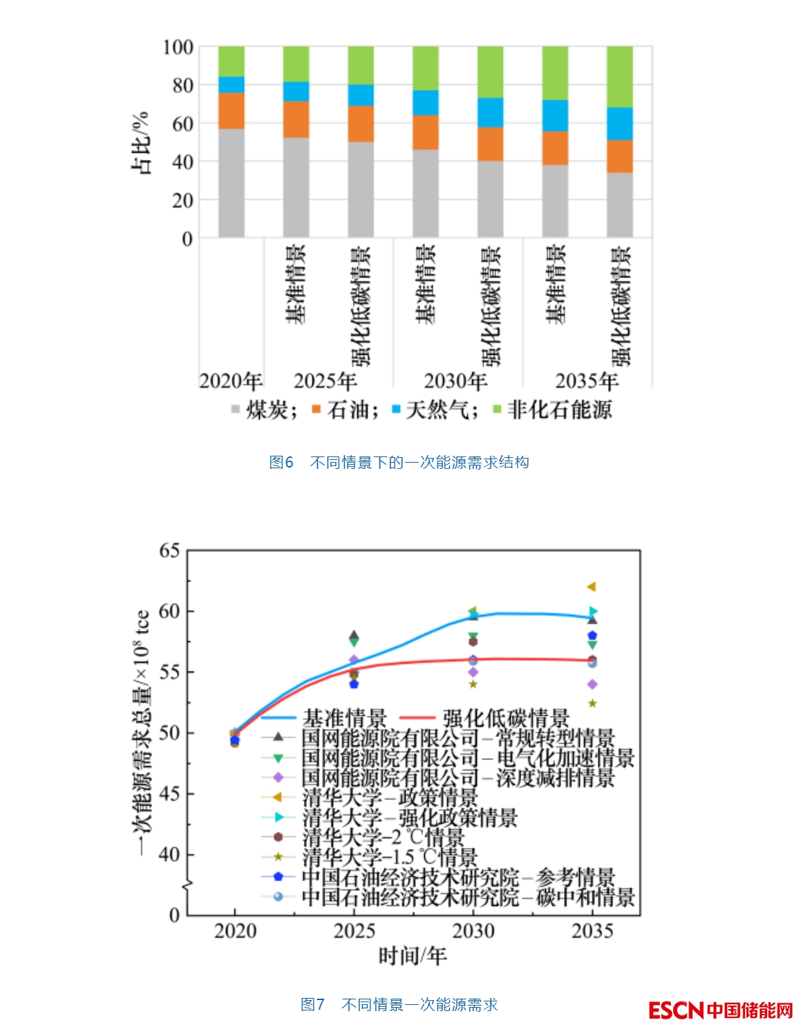 從未來(lái)能源消費(fèi)格局看,能源消費(fèi)的主要部門(mén)依然是以工業(yè)為主。2020年,我國(guó)終端能源消費(fèi)總量約為3.234×109 tce(扣除用作原料、材料的能源,按電熱當(dāng)量計(jì)算),其中,工業(yè)用能占比約為62.5%。2035年,終端能源消費(fèi)總量將進(jìn)一步提升至3.527×109 tce(扣除用作原料、材料的終端能源消費(fèi)),其中工業(yè)用能占能源消費(fèi)總量的比例約為53.5%(見(jiàn)圖5)。終端用能結(jié)構(gòu)也將發(fā)生顯著變化,電氣化的比例將進(jìn)一步提高。例如,2035年工業(yè)部門(mén)的電氣化比例可達(dá)到37%以上,交通運(yùn)輸?shù)碾姎饣壤稍黾拥?2%以上,建筑部門(mén)電氣化水平可達(dá)到54%。在碳中和目標(biāo)的推動(dòng)下,終端電氣化進(jìn)程還將不斷推進(jìn)。2035年前,我國(guó)能源需求總量仍將持續(xù)增長(zhǎng)(見(jiàn)圖6)。2020年至2025年,一次能源需求總量的年均增長(zhǎng)速度為2.1%~2.3%。基準(zhǔn)情景下,我國(guó)一次能源需求總量在2025年將達(dá)到5.57×109 tce,2035年達(dá)到5.96×109 tce。強(qiáng)化低碳情景下,2025年我國(guó)一次能源需求總量為5.52×109 tce,2035年約為5.56×109 tce(見(jiàn)圖7)?;鶞?zhǔn)情景下能源需求總量大約在2030年達(dá)峰。在強(qiáng)有力的政策支持和技術(shù)促進(jìn)下,我國(guó)能源需求總量有望在2030年前達(dá)到峰值然后開(kāi)始下降,從而為碳中和的實(shí)現(xiàn)留出空間。由于方法設(shè)計(jì)、情景設(shè)置、政策環(huán)境、技術(shù)發(fā)展等方面的不同研判,已有研究對(duì)未來(lái)能源需求總量判斷呈現(xiàn)差異,但這些研究證實(shí)了同樣的趨勢(shì),即能源需求總量增速將放緩。