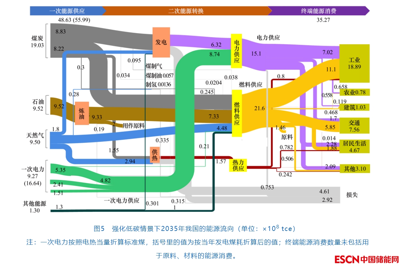 能源供應(yīng)、轉(zhuǎn)換與消費(fèi)受能源技術(shù)、經(jīng)濟(jì)社會(huì)、政策因素等多方面的綜合影響。圖5為2035年強(qiáng)化低碳情景下我國(guó)的能源供應(yīng)、轉(zhuǎn)換與消費(fèi)情況。從能源供應(yīng)能力看,2035年前煤炭在我國(guó)能源供應(yīng)中依舊發(fā)揮重要的保障作用。煤炭將提供34%左右的一次能源供應(yīng),相較2020年降低約22.8%(見(jiàn)圖6中強(qiáng)化低碳情景)。天然氣的供應(yīng)能力將達(dá)到9.5×108 tce,約占能源供應(yīng)總量的17%,較2020年的天然氣消費(fèi)量翻一倍。非化石能源供應(yīng)將提高至1.794×109 tce,約占一次能源供應(yīng)總量的32%??梢?jiàn),煤炭依然將發(fā)揮重要的能源安全保障兜底作用,天然氣將起到重要的過(guò)渡支撐作用。隨著能源結(jié)構(gòu)不斷向綠色低碳化轉(zhuǎn)變,風(fēng)光等可再生能源在能源結(jié)構(gòu)中的占比顯著上升。相比2020年,包括風(fēng)光在內(nèi)的非化石能源占比將提高12.1~16.1個(gè)百分點(diǎn)。預(yù)計(jì)到2035年,風(fēng)電、光伏、水電等一次電力供應(yīng)能力合計(jì)將達(dá)到7.76×108 tce,占一次電力供應(yīng)總量的比例達(dá)到83.7%(見(jiàn)圖5)。屆時(shí),我國(guó)將基本形成煤炭、油氣和新能源“三足鼎立”的能源供應(yīng)格局。