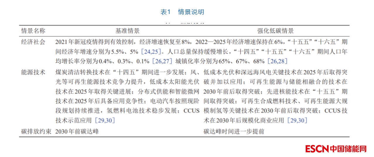 在能源需求總量高、碳排放基數(shù)大的發(fā)展現(xiàn)狀下,預(yù)測(cè)“雙碳”目標(biāo)下我國(guó)不同行業(yè)的中長(zhǎng)期能源需求,對(duì)實(shí)現(xiàn)碳達(dá)峰、碳中和意義重大。本文通過(guò)結(jié)合我國(guó)經(jīng)濟(jì)社會(huì)發(fā)展、碳減排承諾以及能源安全新戰(zhàn)略,綜合考慮不同階段各類能源技術(shù)發(fā)展水平,設(shè)置基準(zhǔn)情景和強(qiáng)化低碳情景(見(jiàn)表1)預(yù)測(cè)我國(guó)中長(zhǎng)期能源需求,進(jìn)而推演我國(guó)實(shí)現(xiàn)碳達(dá)峰、碳中和目標(biāo)的中長(zhǎng)期能源低碳發(fā)展路徑。