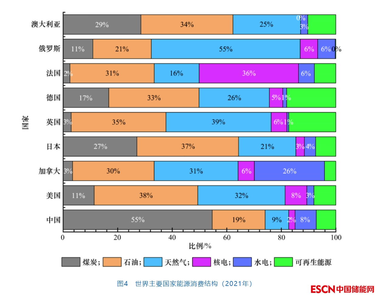相比其他發(fā)達(dá)國(guó)家,我國(guó)煤炭在能源消費(fèi)結(jié)構(gòu)中的比重過(guò)高。如圖4所示,美國(guó)的煤炭消費(fèi)占比僅為11%,英國(guó)、法國(guó)、加拿大等國(guó)的煤炭占比則在5%以下,澳大利亞因其煤炭資源豐富,其煤炭消費(fèi)占比為29%。這些國(guó)家目前已進(jìn)入了油氣消費(fèi)為主體、核能和可再生能源并舉的能源消費(fèi)階段。對(duì)我國(guó)而言,需要在不到40年的時(shí)間里將56%的煤、近85%的化石能源結(jié)構(gòu)逐步轉(zhuǎn)換為以可再生能源為主體,煤炭、油氣為保障的能源消費(fèi)結(jié)構(gòu)。中國(guó)能源結(jié)構(gòu)低碳化調(diào)整的任務(wù)是緊迫而艱巨的。