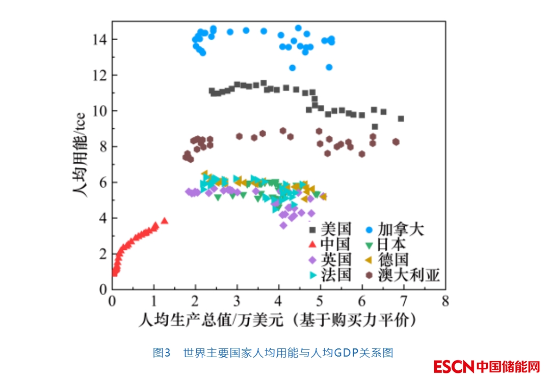 從發(fā)達(dá)國(guó)家的人均用能與人均GDP發(fā)展歷程來(lái)看(見(jiàn)圖3),絕大部分發(fā)達(dá)國(guó)家人均用能都已進(jìn)入了峰值,并維持平穩(wěn)增長(zhǎng)或開(kāi)始下降。美國(guó)、加拿大、澳大利亞、英國(guó)、德國(guó)、法國(guó)、日本等國(guó)家的人均用能大約都是在人均GDP 20 000~30 000美元(現(xiàn)價(jià))的時(shí)候進(jìn)入了峰值,隨后保持平穩(wěn)或緩慢下降。我國(guó)人均用能和人均GDP均處于快速增長(zhǎng)階段,人均GDP從1990年的318美元(現(xiàn)價(jià))增加到2021年的12 556美元(現(xiàn)價(jià)),人均用能相應(yīng)地從0.86 tce增加至3.7 tce,尚未達(dá)到峰值。預(yù)計(jì)到2035年,我國(guó)的人均GDP將達(dá)到中等發(fā)達(dá)國(guó)家的水平。這期間,依然需要不斷增加的能源消費(fèi)總量來(lái)支撐我國(guó)的經(jīng)濟(jì)發(fā)展。