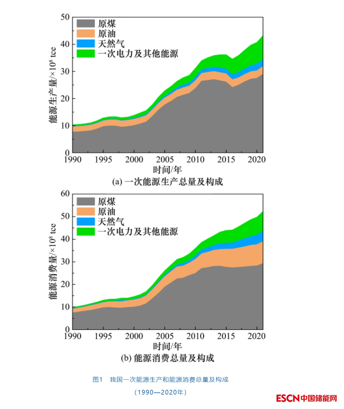 在能源供給側(cè),我國(guó)能源工業(yè)迅速發(fā)展,能源結(jié)構(gòu)加快向清潔低碳方向轉(zhuǎn)變。自改革開(kāi)放以來(lái),我國(guó)一次能源生產(chǎn)總量不斷增長(zhǎng),從1990年的1.0392×109 tce提高至2021年的4.33×109 tce(見(jiàn)圖1(a)),平均每年以4.7%的增速增長(zhǎng)。其中,煤炭生產(chǎn)量年均增長(zhǎng)4.4%,原油生產(chǎn)量年均增長(zhǎng)1.2%,天然氣年均增長(zhǎng)8.5%,一次電力及其他能源生產(chǎn)年均增速達(dá)9.7%。電力發(fā)展迅速,供應(yīng)能力持續(xù)增強(qiáng),2021年累計(jì)發(fā)電裝機(jī)容量達(dá)到2.377×109 kW,發(fā)電量8.377×1012 kW·h,較2000年分別增長(zhǎng)了6.44倍和5.12倍。可再生能源利用規(guī)??焖贁U(kuò)大,水電、風(fēng)電、光伏發(fā)電累計(jì)裝機(jī)容量均居世界首位。截至2022年3月31日,我國(guó)運(yùn)行核電機(jī)組共54臺(tái),裝機(jī)容量55 805.74 MWe,居世界第二。此外,能源輸送能力顯著提高,能源儲(chǔ)備體系也不斷健全。不斷提升的能源供給能力為我國(guó)國(guó)民經(jīng)濟(jì)的持續(xù)快速發(fā)展提供了堅(jiān)實(shí)的保障與支撐。