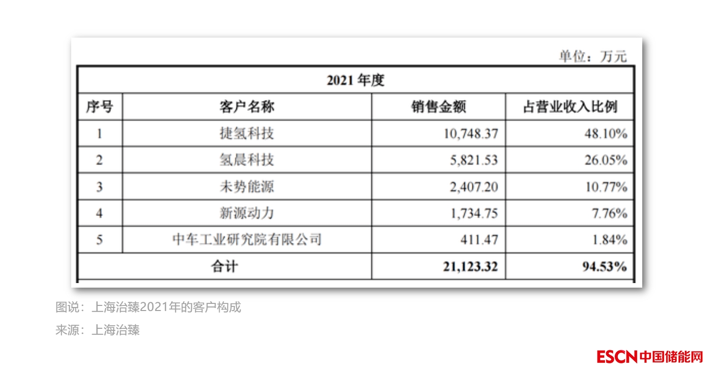 2019年至2021年,捷氫科技一直是上海治臻的第一大客戶(hù),來(lái)自捷氫科技的銷(xiāo)售額分別為1842.87萬(wàn)元、3558.36萬(wàn)元和1.07億元,占營(yíng)業(yè)收入的比例分別高達(dá)67.00%、51.12%和48.10%。
