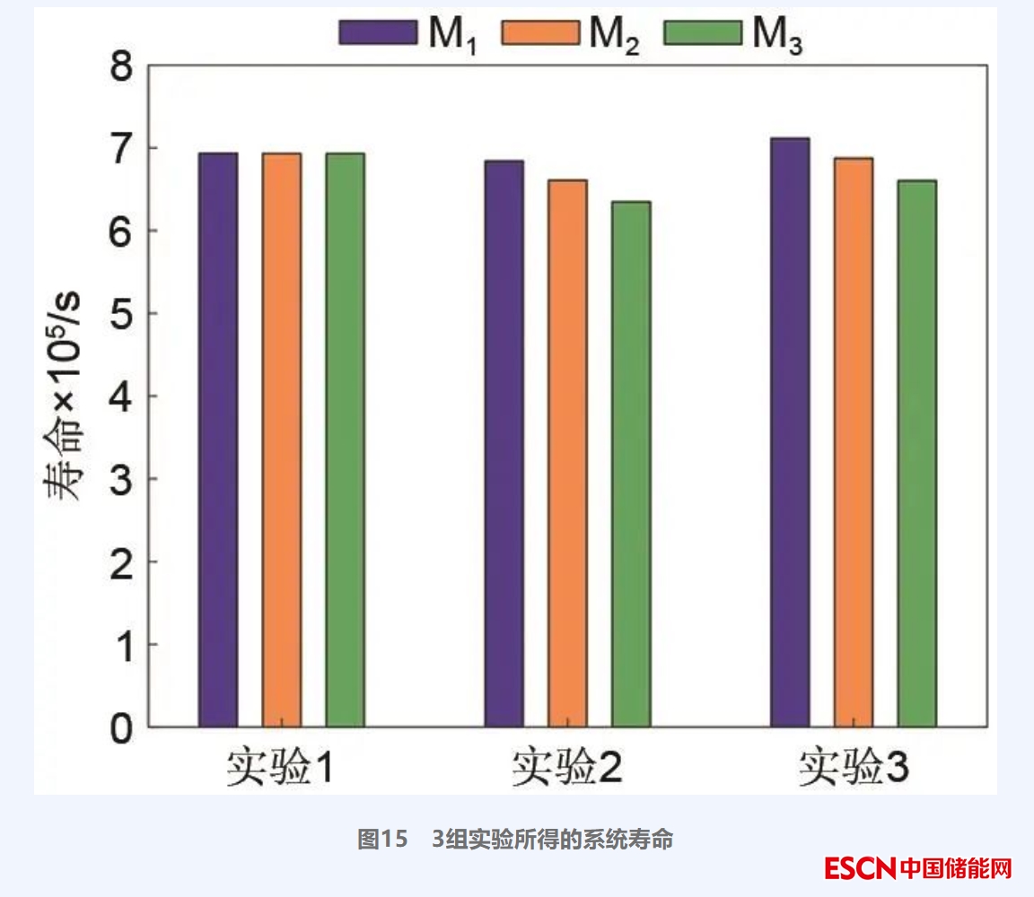 根據(jù)圖15可知,實驗1中M1~M3的壽命分別為693298 s、693083 s、693084 s;實驗2中M1~M3的壽命分別為684051 s、660828 s、634667 s;實驗3中M1~M3的壽命分別為711607 s、687305 s、660229 s。另外,實驗1中各模組的平均壽命差為143 s,最大壽命差為215 s,實驗2中各模組的平均壽命差為32923 s,最大壽命差為49384 s,實驗3中各模組的平均壽命差為34252 s,最大壽命差為51378 s。故由3組實驗的實驗數(shù)據(jù)可知實驗1中3個并聯(lián)模組的壽命幾乎相同,而實驗2和實驗3中的3個并聯(lián)模組的壽命差則非常大。對于實驗2和3的情況而言,若M2和M3提前達到截止壽命時,各個并聯(lián)模組之間不再具備互為備用的關(guān)系,系統(tǒng)可靠性降低,需要運維人員及時更換電池模塊。而并聯(lián)的電池模組數(shù)目越多,運維的成本也就越大。若將本文所提方法應(yīng)用到實際場站,則可以在整個運行過程中始終保障備用電源系統(tǒng)的高可靠性,且僅需在各個模組到達截止壽命時,對備用電源進行一次運維。另外,圖15中,實驗1中各電池模組的平均壽命為693155 s,實驗2中各電池模組的平均壽命為659849 s。故對比實驗1和實驗2可知,在使電池模組組內(nèi)電池單體的SOC保持一致的基礎(chǔ)上,使用本文所提的多時間尺度均衡算法可以延長系統(tǒng)的平均壽命。這也間接說明僅考慮電池短時間尺度的均衡,不考慮電池長時間尺度的均衡,并不能在長時間尺度最大化利用電池的能量。