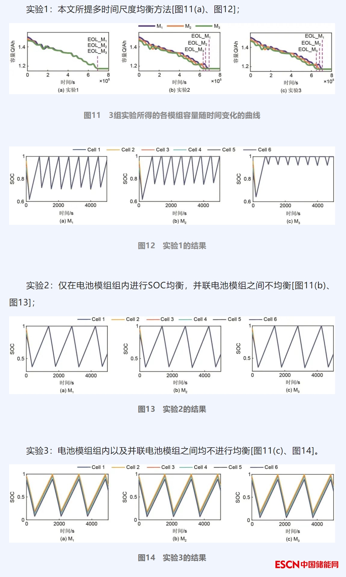 為了合理設(shè)計該均衡方法,根據(jù)電池工作特性設(shè)計了包含電池模組組內(nèi)SOC旁路均衡算法和基于功率加權(quán)的壽命均衡控制算法的多時間尺度均衡算法。為了驗證所提均衡算法的可行性以及有效性,對鋰電池進行了HPPC以及加速老化測試,然后根據(jù)試驗數(shù)據(jù),建立了鋰電池電-老化模型。最后,設(shè)計了3組對比實驗。實驗結(jié)果顯示文章所提的多時間尺度均衡算法不僅可以保持電池模組組內(nèi)SOC均衡,也能在長時間尺度上讓各電池模組同時達到壽命終止,兼顧單體SOC的一致性和電池模組壽命的一致性。這不僅解決了串聯(lián)電池組的木桶效應(yīng),也減少了電池的更換次數(shù),降低系統(tǒng)的運維成本。