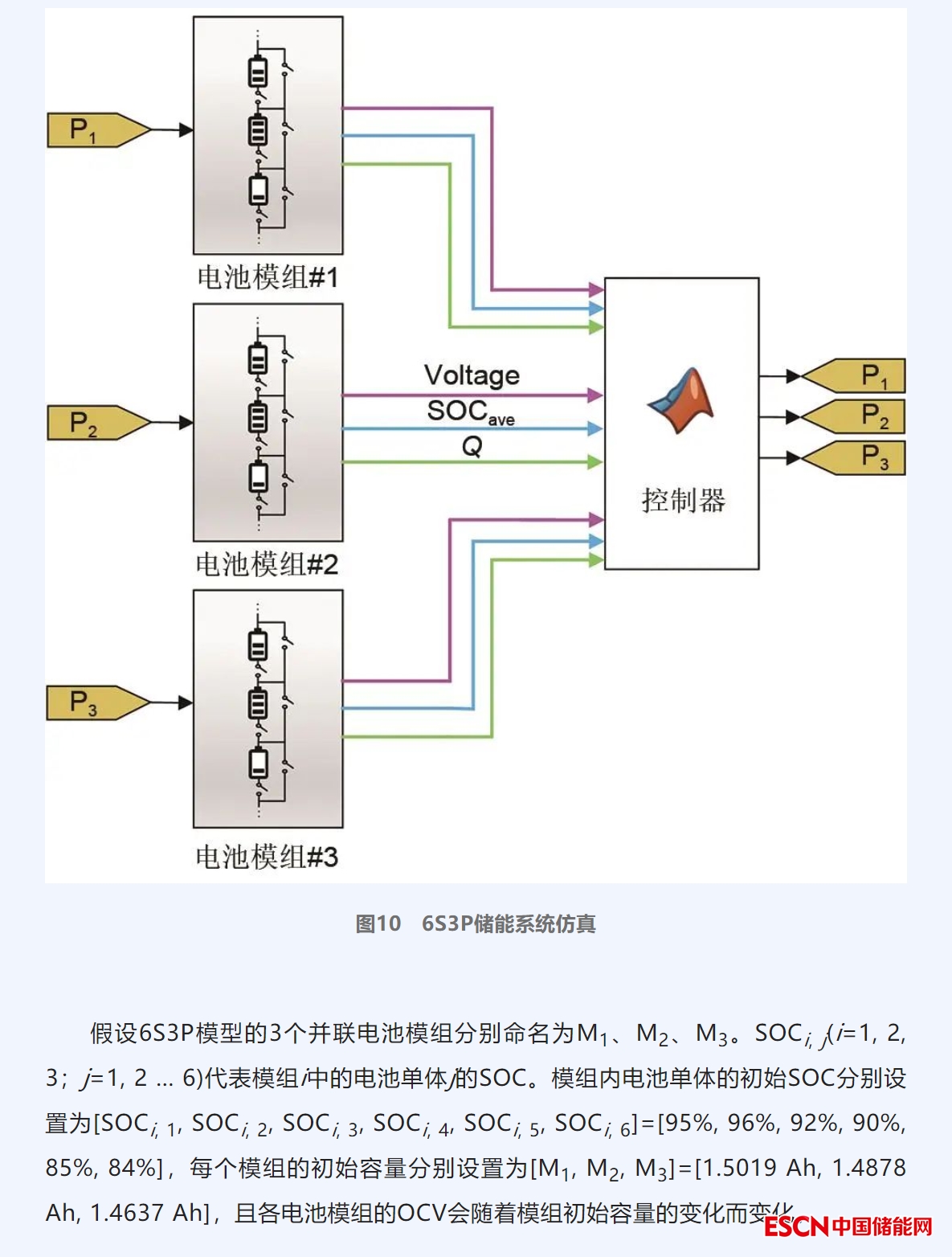 為了驗證所提算法的效果,設(shè)計了3組對比實驗,利用MATLAB/Simulink仿真平臺搭建了由3組電池模組并聯(lián)組成的小型儲能系統(tǒng),其中3個并聯(lián)電池模組由6塊電池單體串聯(lián)組成(6S3P),且設(shè)定恒功率負載為P=500 W。圖10為儲能系統(tǒng)的仿真示意圖,控制器中包含完整的均衡算法??刂破鞲鶕?jù)電池模組電壓、SOC、容量等參數(shù)輸出電池模組需要輸出的功率并將該功率反饋給各電池模組。