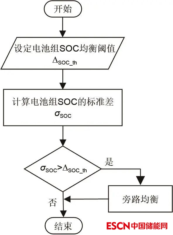 串聯(lián)電池組SOC旁路均衡算法的基本策略是:根據(jù)電池組SOC值的標準差判斷電池組是否需要均衡。若電池組SOC的標準差小于所設(shè)定的閾值,表示電池組SOC不需要均衡,則電池組串聯(lián)運行。若電池組SOC的標準差大于所設(shè)定的閾值,則需要對電池組進行旁路均衡。假定電池組需要旁路Nbypass塊單體,判斷此時電池組的充放電狀態(tài)。若電池組放電,則通過控制開關(guān)陣列旁路Nbypass塊能量最低的電池單體;若電池組充電,則通過控制開關(guān)陣列旁路Nbypass塊能量最高的電池單體。該算法的流程如圖5所示。