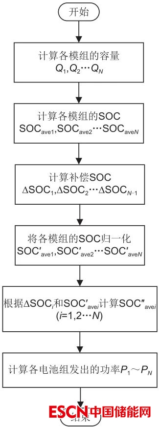 并聯(lián)電池模組壽命均衡的本質(zhì)是根據(jù)各模組的健康狀態(tài)控制電池的放電深度,整體原則為:剩余壽命越少,則該組電池模組的放電深度越淺;剩余壽命越多,則該組電池模組的放電深度越深。結(jié)合本文的拓撲結(jié)構(gòu),利用DC-DC轉(zhuǎn)換器調(diào)控各電池模組的發(fā)出功率,就可以達到控制模組放電深度的目的。故根據(jù)上述原理,本文提出了基于功率加權(quán)的壽命均衡控制算法,如圖4所示:首先計算各電池模組應(yīng)該提供的補償SOC;然后將各電池模組的容量除以參考容量,得到關(guān)于荷電量的權(quán)重因數(shù),并利用該因數(shù)去修正各電池模組的SOC(即歸一化)。最后,再將各電池模組的SOC除以各電池模組SOC之和,得到關(guān)于功率的權(quán)重因數(shù),并根據(jù)該因數(shù)和補償SOC得到各電池模組需要提供的實際功率。算法的具體內(nèi)容如下: