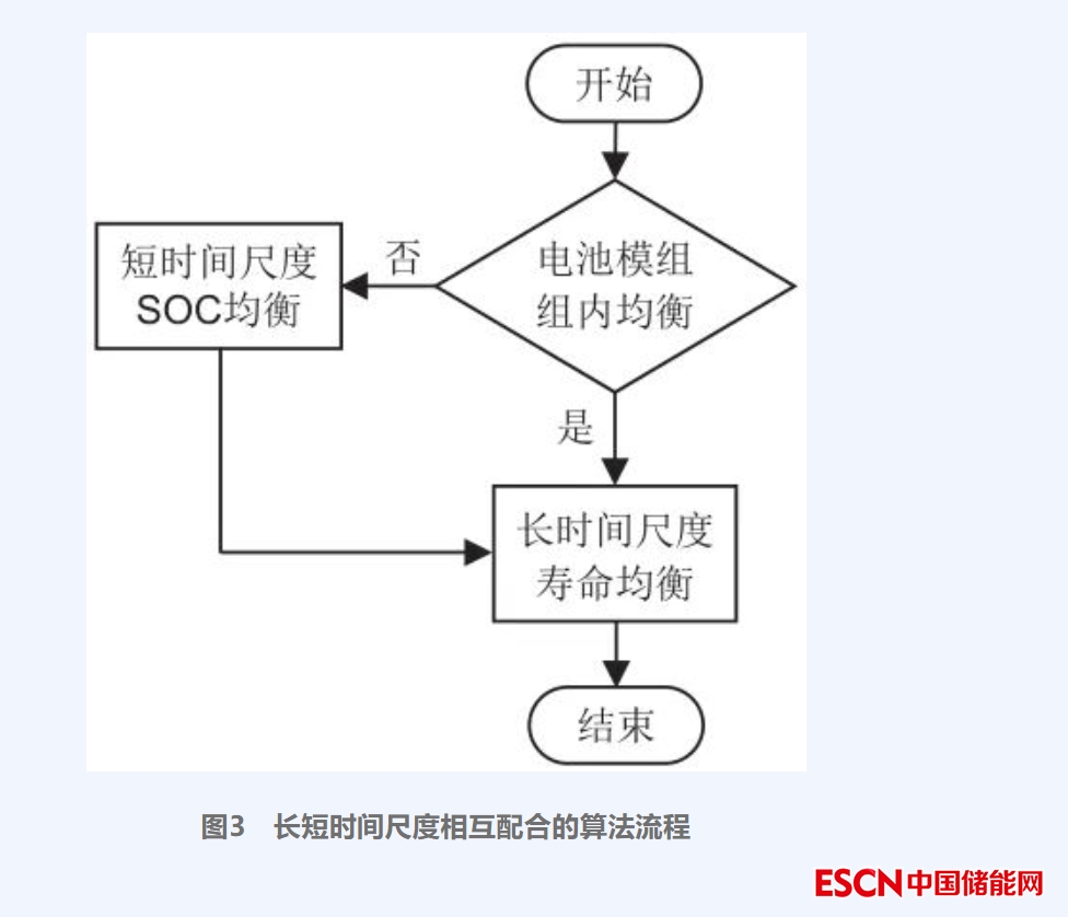 本文所提對串并聯(lián)電池組的多時間尺度均衡方法:在短時間尺度內(nèi),使串聯(lián)電池組組內(nèi)SOC在短時間內(nèi)快速達到均衡;在長時間尺度上,根據(jù)并聯(lián)電池模組的老化程度調(diào)節(jié)其充放電深度,以此實現(xiàn)壽命均衡。圖3描述了均衡算法中長短時間尺度均衡如何協(xié)調(diào):當串聯(lián)電池組組內(nèi)SOC在短時間快速達到均衡后就可以啟動長時間尺度壽命均衡。