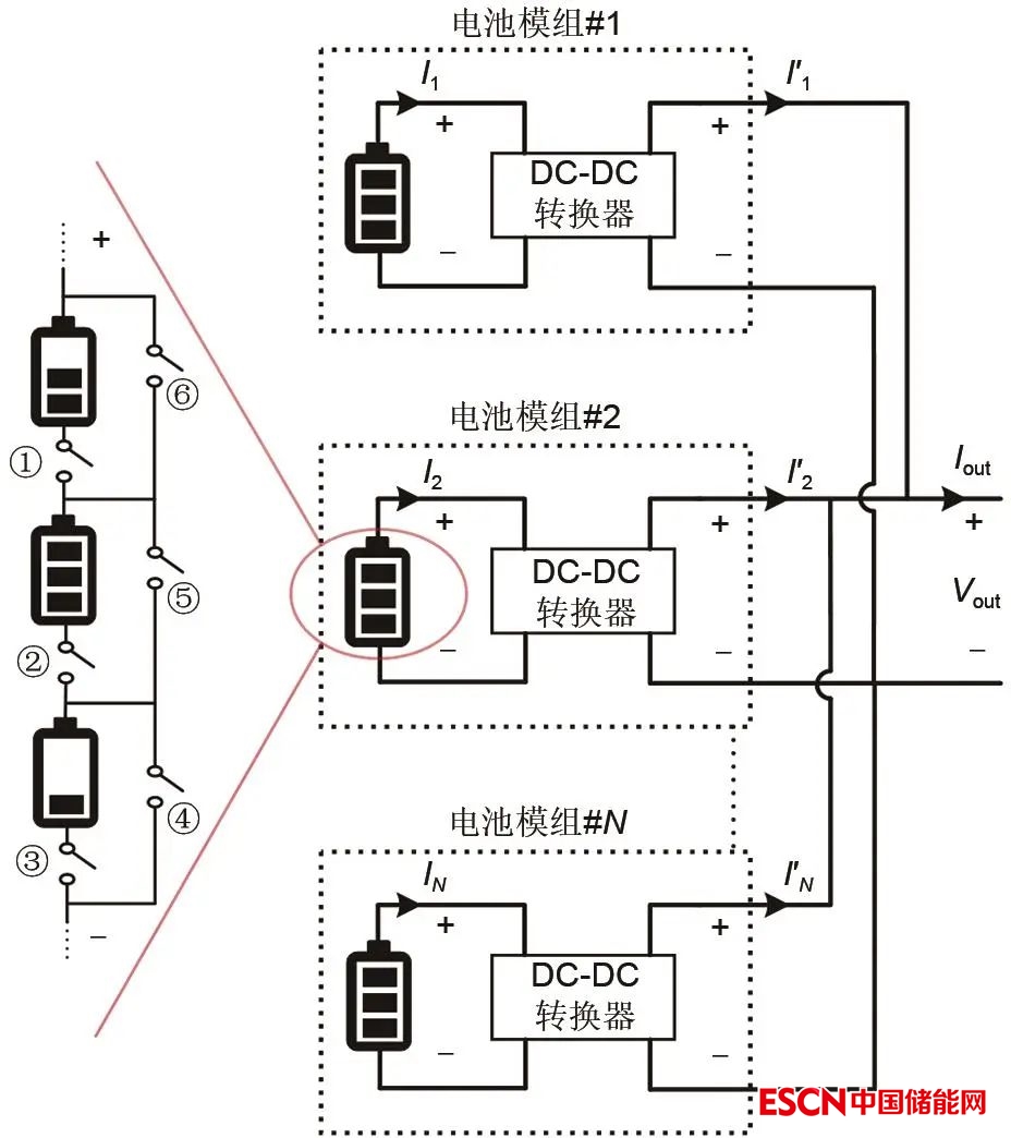并聯(lián)電池組的均衡電路需要與電池/電池組隔離,常用的均衡拓撲結(jié)構(gòu)為每個電池模組配備獨立的DC-DC轉(zhuǎn)換器,使得每組電池的充/放電量可以獨立控制。Moo等通過為并聯(lián)電池組中的每塊電池單體配備DC-DC轉(zhuǎn)換器獨立控制每塊電池的電流。該方法不僅能夠避免電池組過充放,同時也有利于電池組工作過程的SOC、SOH(state of health,健康狀態(tài))估計。Cao等提出了一種多輸入單輸出的電池系統(tǒng),即為每組電池模塊配備獨立的DC-DC轉(zhuǎn)換器后將所有模組串聯(lián)為負載供電。該系統(tǒng)不僅能夠使并聯(lián)電池組達到SOC均衡,也能在文獻[32]所提均衡拓撲基礎(chǔ)上減少電池系統(tǒng)所需的元件數(shù)。Ur Rehman等則為每塊電池配備獨立的DC-DC轉(zhuǎn)換器后,設(shè)計算法增加高SOH電池的放電深度,以提高電池衰減的一致性、延長電池組的整體壽命。