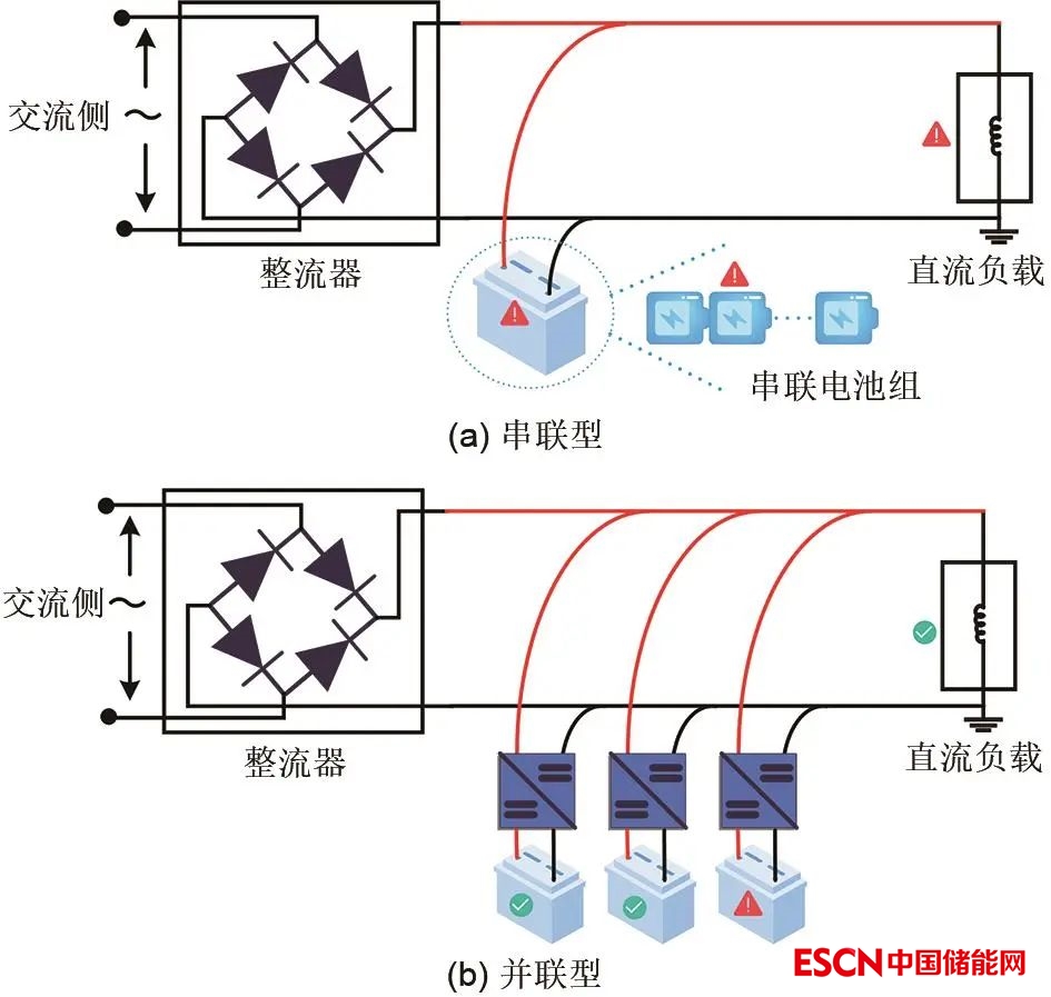 后備電源在系統(tǒng)發(fā)生故障時,能夠保障核心設(shè)備的正常工作。相比于閥控密閉鉛酸電池,鋰離子電池(以下簡稱“鋰電池”)因能量密度高、無記憶性、低自放電率、綠色環(huán)保等優(yōu)勢被廣泛應(yīng)用于電力直流電源系統(tǒng)。后備電源的傳統(tǒng)技術(shù)方案是將多節(jié)電池串聯(lián)成組后并入直流母線,如圖1(a)所示。該技術(shù)方案最為明顯的缺點是:若單節(jié)電池損壞,后備系統(tǒng)將直接故障。對于高壓故障,如無法提供后備操作電源,將導致本級斷路器無法分閘,甚至直接使上級電網(wǎng)跳閘。另外,由于電池單體電壓一般在4 V左右,為了滿足直流系統(tǒng)高電壓的需求,需要將幾十甚至上百節(jié)單體串聯(lián)。而串聯(lián)電池越多,各電池單體之間的均衡就越復(fù)雜。所以,針對上述傳統(tǒng)技術(shù)方案的缺點,出現(xiàn)了先串聯(lián)電池后并聯(lián)模組的并聯(lián)型備用電源方案,并聯(lián)型方案如圖1(b)所示。即先將性能相對一致的電池串聯(lián)成組,再為各串聯(lián)電池組配備獨立的DC-DC轉(zhuǎn)換器并聯(lián)后為負載供電。以這種并聯(lián)模組代替后備電源傳統(tǒng)的串聯(lián)模式,不僅避免了因某塊電池單體故障導致整個串聯(lián)電池組無法使用的木桶效應(yīng),并且并聯(lián)模組之間能夠互為備用,顯著提高了后備電源的可靠性與能量利用率。
