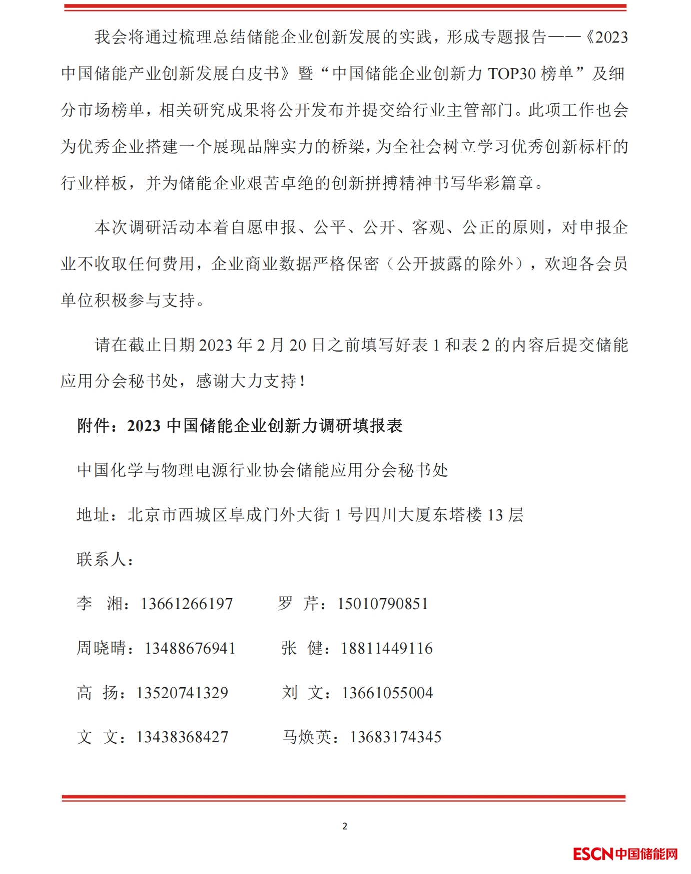 請在截止日期2023年2月20日之前填寫好表1和表2的內(nèi)容后提交儲能應(yīng)用分會秘書處,感謝大力支持!