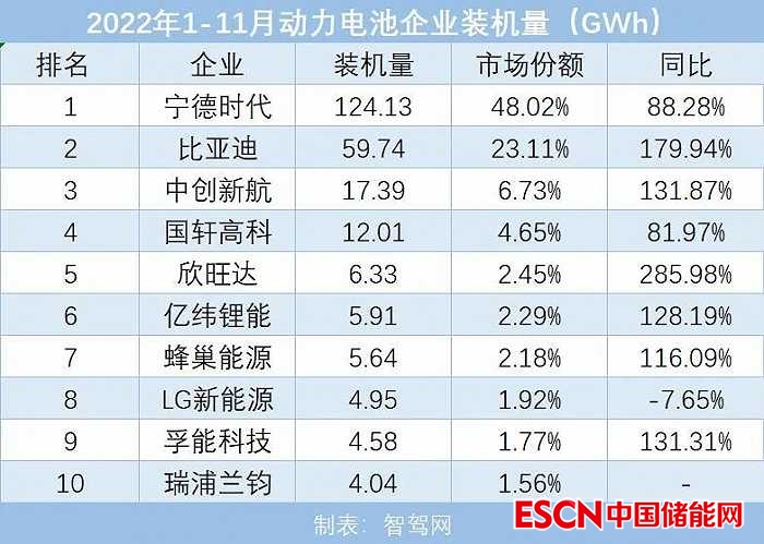 其中,寧德時(shí)代在營收規(guī)模上已連續(xù)五年拿下全球第一,其2022年1-11月動(dòng)力電池的裝機(jī)量為124.13GWh,同比增長了88.23%,占據(jù)的市場份額高達(dá)48.02%。