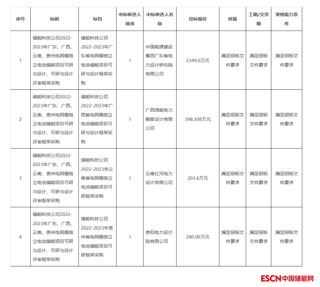 中國儲能網(wǎng)訊:1月12日,南方電網(wǎng)儲能科技公司2022-2023年廣東、廣西、云南、貴州電網(wǎng)側(cè)獨(dú)立電池儲能項目可研與設(shè)計、可研與設(shè)計評審框架采購中標(biāo)候選人公示。