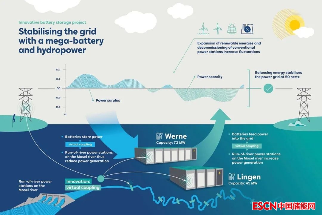 這二個(gè)電池儲(chǔ)能系統(tǒng)的特別之處在于它們與德國摩澤爾河沿岸的RWE徑流式水電站通過智能管理系統(tǒng)進(jìn)行虛擬耦合連接。