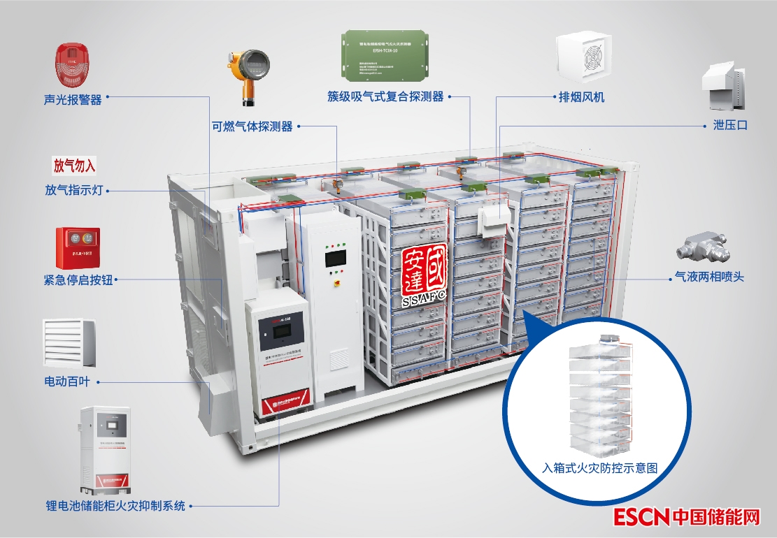 國安達(dá)新一代儲(chǔ)能站消防安全解決方案,推出創(chuàng)新研發(fā)的鋰電池儲(chǔ)能柜火災(zāi)抑制系統(tǒng),采用分簇式集中式探測、PACK級(jí)滅火防控技術(shù),以電池簇為防護(hù)單元,進(jìn)行極早期火情探測預(yù)警,以PACK為最小防護(hù)單元,進(jìn)行PACK級(jí)噴灑防控。當(dāng)該簇電池箱有單體電池出現(xiàn)熱失控時(shí),可及時(shí)接收并分析電池箱內(nèi)的火災(zāi)信息,輸出聲光報(bào)警信號(hào),同時(shí)將抑制介質(zhì)通過管路噴頭噴灑到發(fā)生熱失控的電池箱內(nèi)。