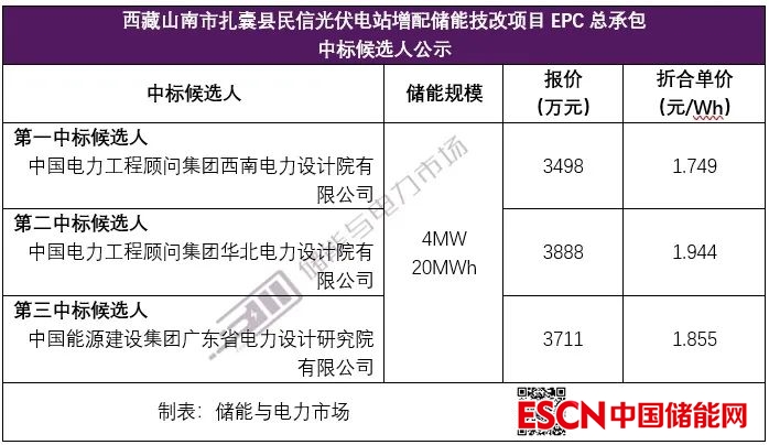 中國電力工程顧問集團(tuán)西南電力設(shè)計(jì)院有限公司以總報(bào)價(jià)3498萬元,折合單價(jià)1.749元/Wh,成為第一中標(biāo)候選人。第二、第三中標(biāo)候選人報(bào)價(jià)分別為:1.944元/Wh,1.855元/Wh。