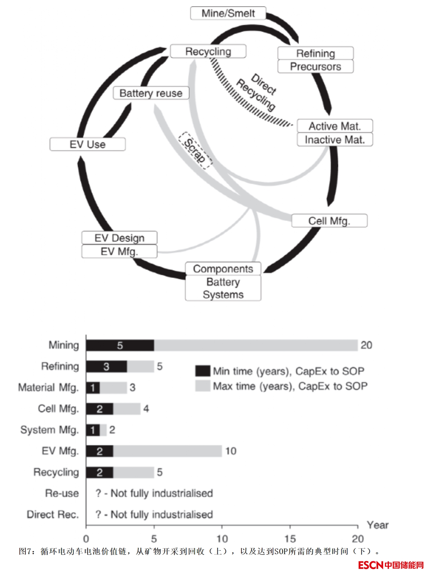 實驗室規(guī)模的材料開發(fā)和工程改進(jìn)可能是將新技術(shù)推向市場的主要障礙。雖然諸如將材料生產(chǎn)從克級擴展到噸級的挑戰(zhàn)已被充分理解,但其他問題往往被忽視,如復(fù)雜的價值鏈,需要幾十個供應(yīng)商來采購所有的材料和部件(見圖7,頂部)。建設(shè)一個制造工廠,從資本支出(CapEx)到SOP(圖7,下),可能需要幾年的時間來調(diào)試,而所需時間取決于所生產(chǎn)的產(chǎn)品。一個生產(chǎn)層狀氧化物正極活性材料的化工廠將與生產(chǎn)電池片的工廠截然不同,后者需要精密的制造和高度的自動化才能具有成本競爭力。在這里,我們用一系列的例子來說明供應(yīng)鏈的考慮和不良的成本假設(shè)是如何使技術(shù)發(fā)展脫軌的。