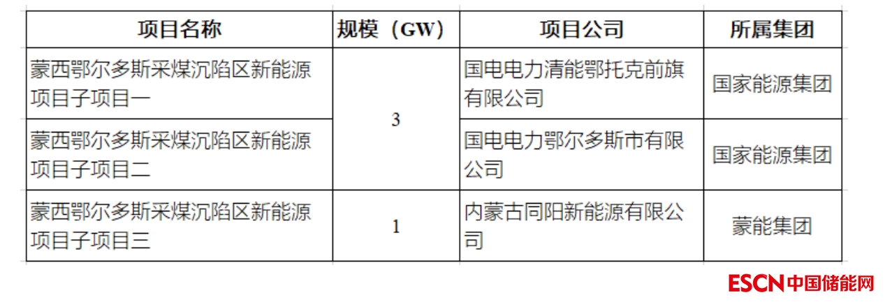 蒙西鄂爾多斯采煤沉陷區(qū)新能源項(xiàng)目共分三個(gè)子項(xiàng)目。其中,國(guó)家能源集團(tuán)獲得兩個(gè)子項(xiàng)目,總規(guī)模為3GW,蒙能集團(tuán)獲得一個(gè)子項(xiàng)目,規(guī)模為1GW。