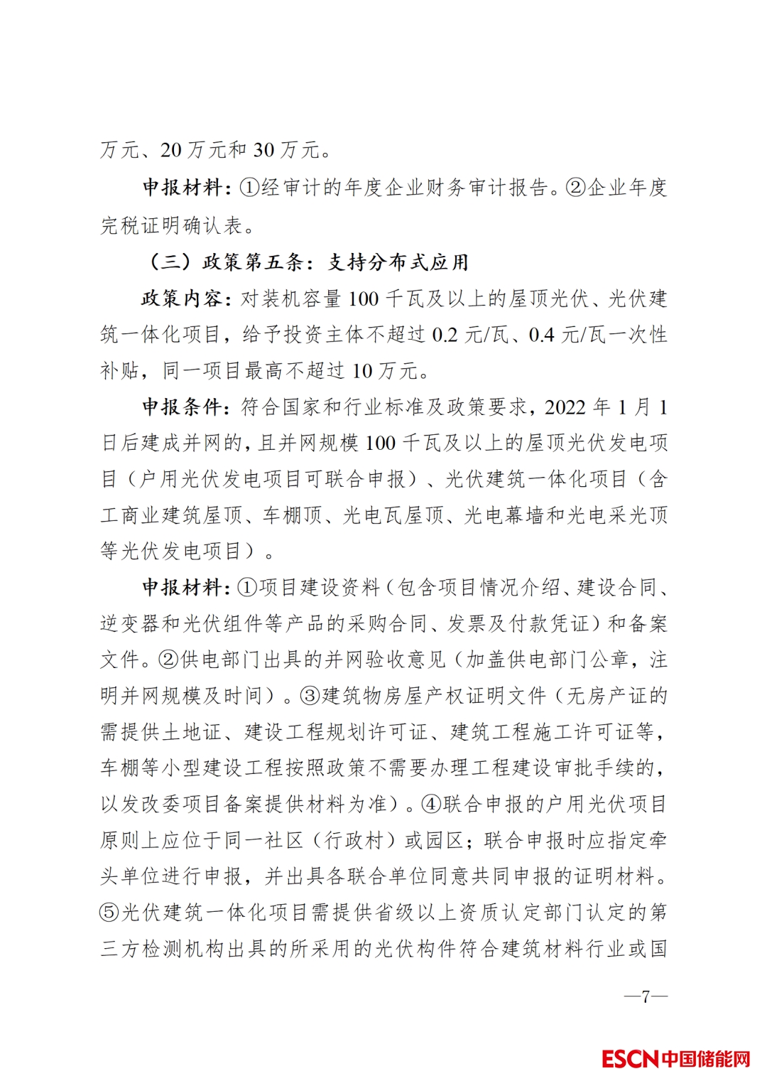 對裝機容量100千瓦及以上的屋頂光伏、光伏建筑一體化項目,給予投資主體不超過0.2元/瓦、0.4元/瓦一次性補貼,同一項目最高不超過10萬元。