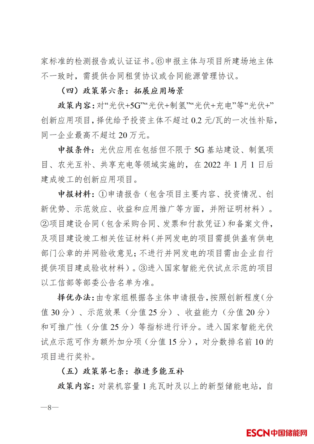 對“光伏+5G”“光伏+制氫”“光伏+充電”等“光伏+”創(chuàng)新應用項目,擇優(yōu)給予投資主體不超過0.2元/瓦的一次性補貼,同一企業(yè)最高不超過20萬元。