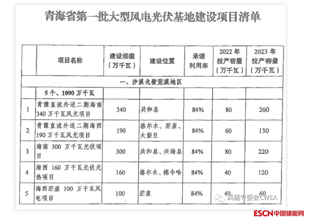 其中第一批以沙戈荒為主的大型風(fēng)光基地建設(shè)項目清單總計9705萬千瓦已全面開工建設(shè),其中沙戈荒地區(qū)容量約4300萬千瓦。青海省第一批大型風(fēng)電光伏基地建設(shè)項目清單共5個,總計1090萬千瓦,分布在共和縣、格爾木、茫崖、德令哈等地區(qū),承諾利用率84%,2022年投產(chǎn)容量300萬千瓦,2023年投產(chǎn)容量790萬千瓦。如下表: