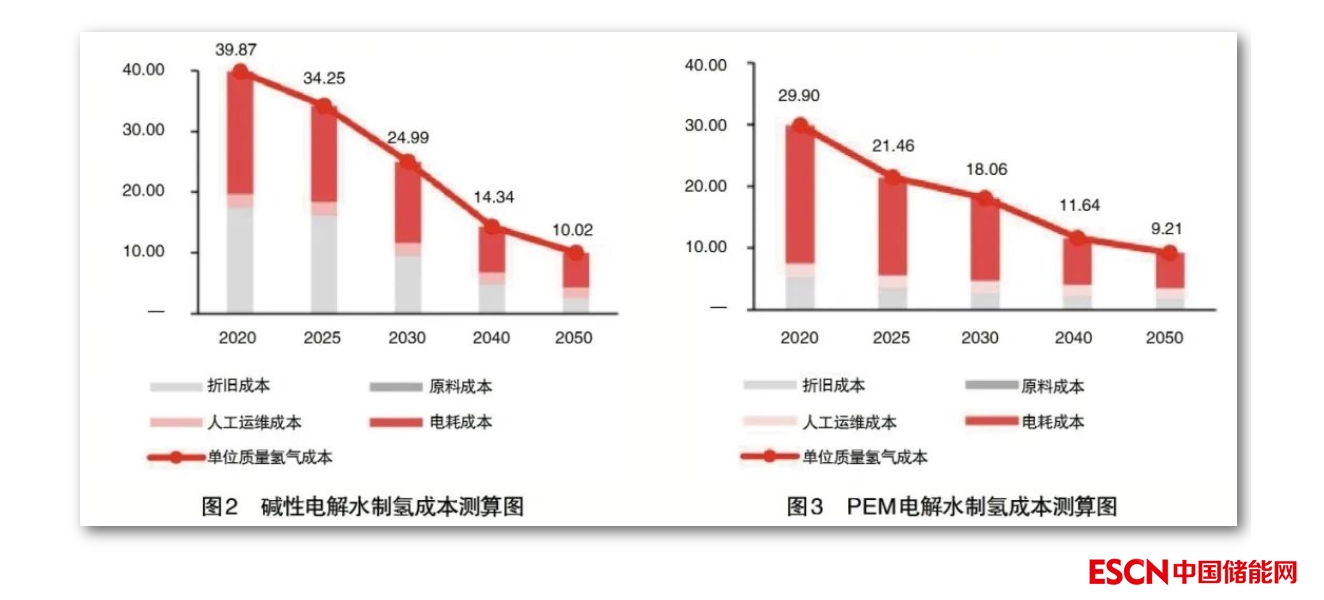 目前,我國(guó)煤制氫成本為9.7~13.7元/千克,天然氣制氫成本為9.8~13.7/千克,焦?fàn)t副產(chǎn)氫的綜合成本為9.3~15元/千克。經(jīng)過(guò)測(cè)算,當(dāng)可再生能源電價(jià)降至0.16元/千瓦時(shí),堿性電解和PEM系統(tǒng)電解設(shè)備價(jià)格分別降至1000元/千瓦和2750元/千瓦之際,堿性電解水制氫和PEM電解水制氫成本分別是11.64元/千克和14.34元/千克,與化石能源制氫(+CCUS技術(shù))的成本相當(dāng);當(dāng)可再生能源電價(jià)降至0.13元/千瓦時(shí),堿性電解和PEM系統(tǒng)電解設(shè)備價(jià)格分別降至800元/千瓦和1400元/千瓦,堿性電解水制氫和PEM電解水制氫成本分別是9.21元/千克和10.02元/千克,與現(xiàn)階段的化石能源制氫成本相當(dāng)。當(dāng)經(jīng)濟(jì)性逐步得到體現(xiàn)后,可再生能源電制氫將成為我國(guó)制氫領(lǐng)域的主力軍,電解水制氫設(shè)備有望迎來(lái)廣闊的發(fā)展機(jī)遇(見(jiàn)圖2、圖3)。