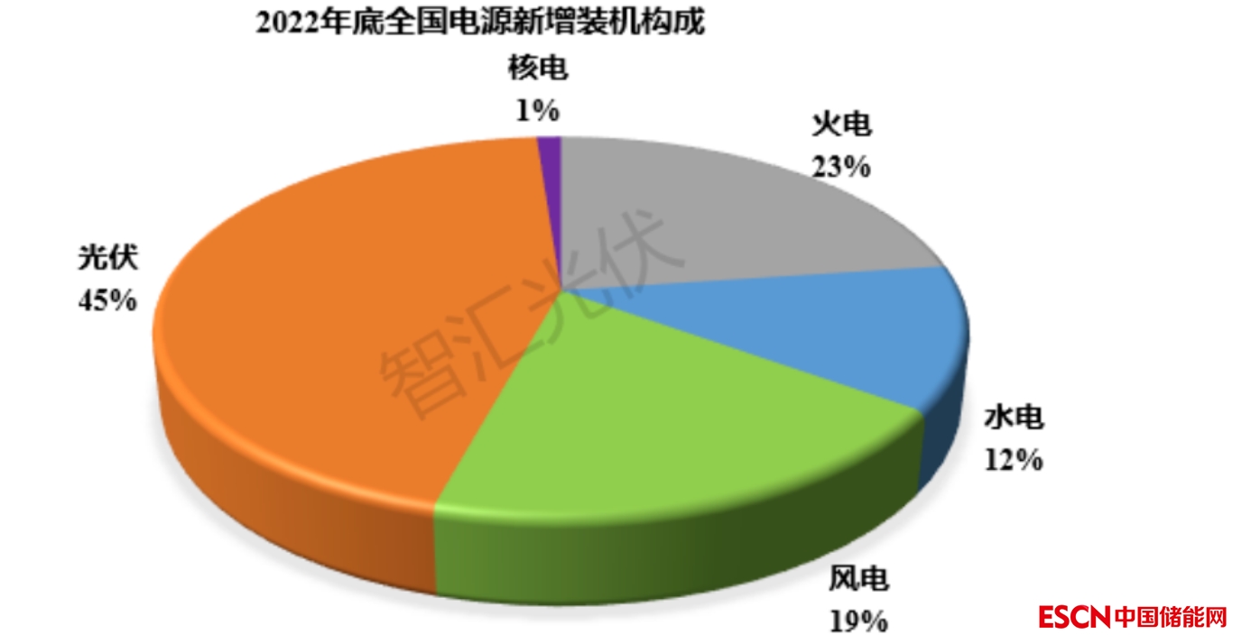 2022年,全國(guó)水電、火電、核電、風(fēng)電、光伏的裝機(jī)容量分別新增2387萬千瓦、4471萬千瓦、227萬千瓦、3763萬千瓦和8741萬千瓦,合計(jì)19974萬千瓦。2022年,各類電源新增裝機(jī)結(jié)構(gòu)如下圖所示。