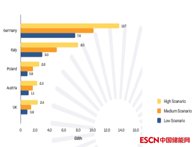 在未來幾年,預(yù)計(jì)德國將在住宅光伏市場(chǎng)穩(wěn)定增長(zhǎng)以及在雄心勃勃的氣候和能源目標(biāo)的支持下,保持其在歐洲住宅電池儲(chǔ)能市場(chǎng)的領(lǐng)先地位。作為歐洲最大的經(jīng)濟(jì)體,德國迫切需要減少對(duì)化石能源進(jìn)口的依賴,高昂的能源零售價(jià)格將確保太陽能發(fā)電設(shè)施和儲(chǔ)能系統(tǒng)的經(jīng)濟(jì)性仍然非常具有吸引力。雖然德國在歐洲將保持第一的地位并不令人驚訝,但意大利預(yù)計(jì)將在2022年接近德國的水平。由于其極具吸引力的Superbonus激勵(lì)計(jì)劃,意大利住宅電池儲(chǔ)能市場(chǎng)規(guī)模預(yù)計(jì)將增長(zhǎng)三倍以上,將超過1GWh,僅比德國在2021年達(dá)到這一里程碑晚一年。由于英國和奧地利的住宅太陽能市場(chǎng)規(guī)模在2022年激增,這兩個(gè)國家的住宅電池儲(chǔ)能市場(chǎng)也將大幅增長(zhǎng),并在2022年分別排名第3和第4位。波蘭和西班牙等國家也成為新的參與者,而住宅電池儲(chǔ)能系統(tǒng)的吸引力在歐洲市場(chǎng)顯著增加。
