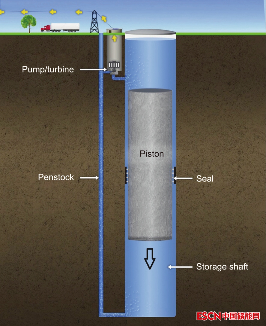 圖6. 重力發(fā)電公司的重力儲能系統(tǒng)概念所用的技術(shù)與抽水蓄能相似。一個由加固巖體制成的大型柱塞,高約為500 m,直徑為50 m,垂直放置在一個灌滿水的密閉系統(tǒng)(圖像不按比例繪制)中。當(dāng)儲存能量時,電力被消耗,將水泵入底部艙室,抬升柱塞。放電時,柱塞下落,將水沖入渦輪發(fā)電機。來源:Gravity Power(已授權(quán))。
