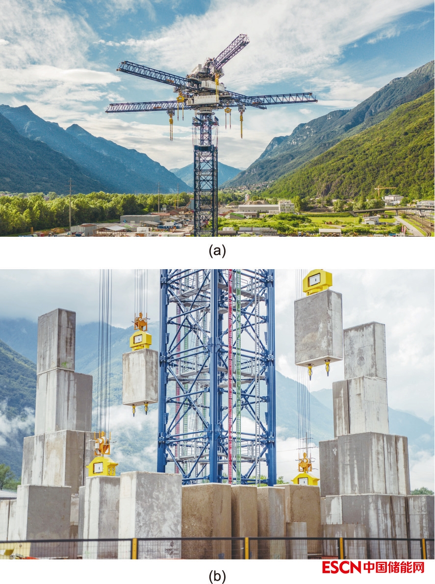 圖3. Energy Vault公司早期技術(shù)商業(yè)示范單元的頂部(a)和基座(b)。該技術(shù)通過起重機抬升或放下35 t的重物來儲存/釋放能量。該項目位于瑞士提契諾州,于2020年完工,并已連接至國家電網(wǎng)。該公司后來決定更換項目為圖1中的封閉式、模塊化設(shè)計。來源:Energy Vault(經(jīng)許可)。