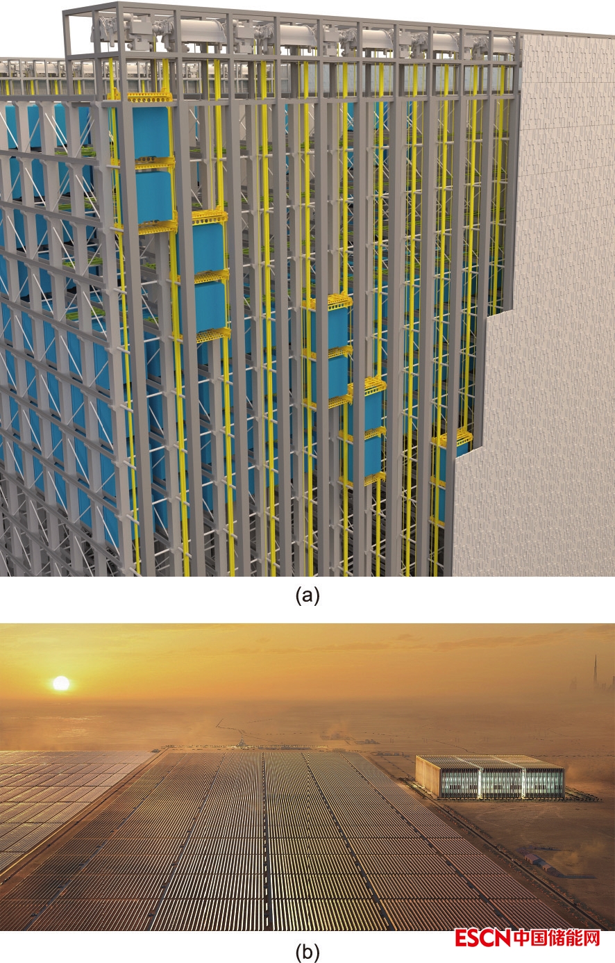 圖1. (a)Energy Vault公司的每“EVx”重力儲能模塊,每塊模塊預(yù)計儲存10 MW·h能量。設(shè)計EVRC需要至少4塊并排模塊,并且最高抬升至120 m高;在該維度下,儲存100 MW·h能量大概需要9713 m2土地。在每個“EVx”模塊結(jié)構(gòu)中,大概有1300個30 t左右的重物(藍(lán)色)被放置在支架上。當(dāng)“充電”時,這些重物被抬起(黃色)并在建筑高層儲存;放電時則相反。(b)太陽能發(fā)電站與相鄰的EVRC,該EVRC有9塊方形“EVx”模塊。在發(fā)電量高時,EVRC將通過重力勢能“穩(wěn)固并形成”復(fù)合發(fā)電設(shè)施的能源,并在日落后再轉(zhuǎn)化為電力。來源:Energy Vault(經(jīng)許可)。