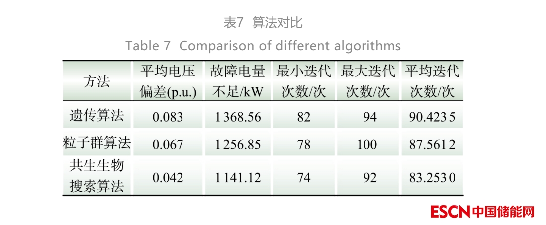 為驗(yàn)證共生生物搜索算法的可行性和優(yōu)越性,將共生生物搜索算法和遺傳算法[24]、粒子群算法[25]進(jìn)行對比,得到的相關(guān)數(shù)據(jù)如表7所示。由表7可知,相對于另外2種算法,采用共生生物搜索算法進(jìn)行計(jì)算時,得到的平均電壓偏差以及故障情況下的電量不足都較小。此外,由最大迭代次數(shù)、最小迭代次數(shù)和平均迭代次數(shù)也可以看出,共生生物搜索算法相對另外2種算法在穩(wěn)定性和收斂性方面具有優(yōu)勢。