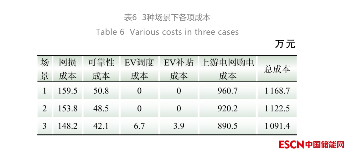 為驗(yàn)證考慮DG和EV集群調(diào)度的配電網(wǎng)絡(luò)重構(gòu)的經(jīng)濟(jì)性,設(shè)置3種場景分別計(jì)算其各項(xiàng)成本進(jìn)行對比。場景1:既不考慮DG也不考慮EV集群調(diào)度的配電網(wǎng)絡(luò)重構(gòu);場景2:只考慮DG但不考慮EV集群調(diào)度的配電網(wǎng)絡(luò)重構(gòu);場景3:既考慮DG同時也考慮EV集群調(diào)度的配電網(wǎng)絡(luò)重構(gòu)。3種場景下計(jì)算的各項(xiàng)成本如表6所示。