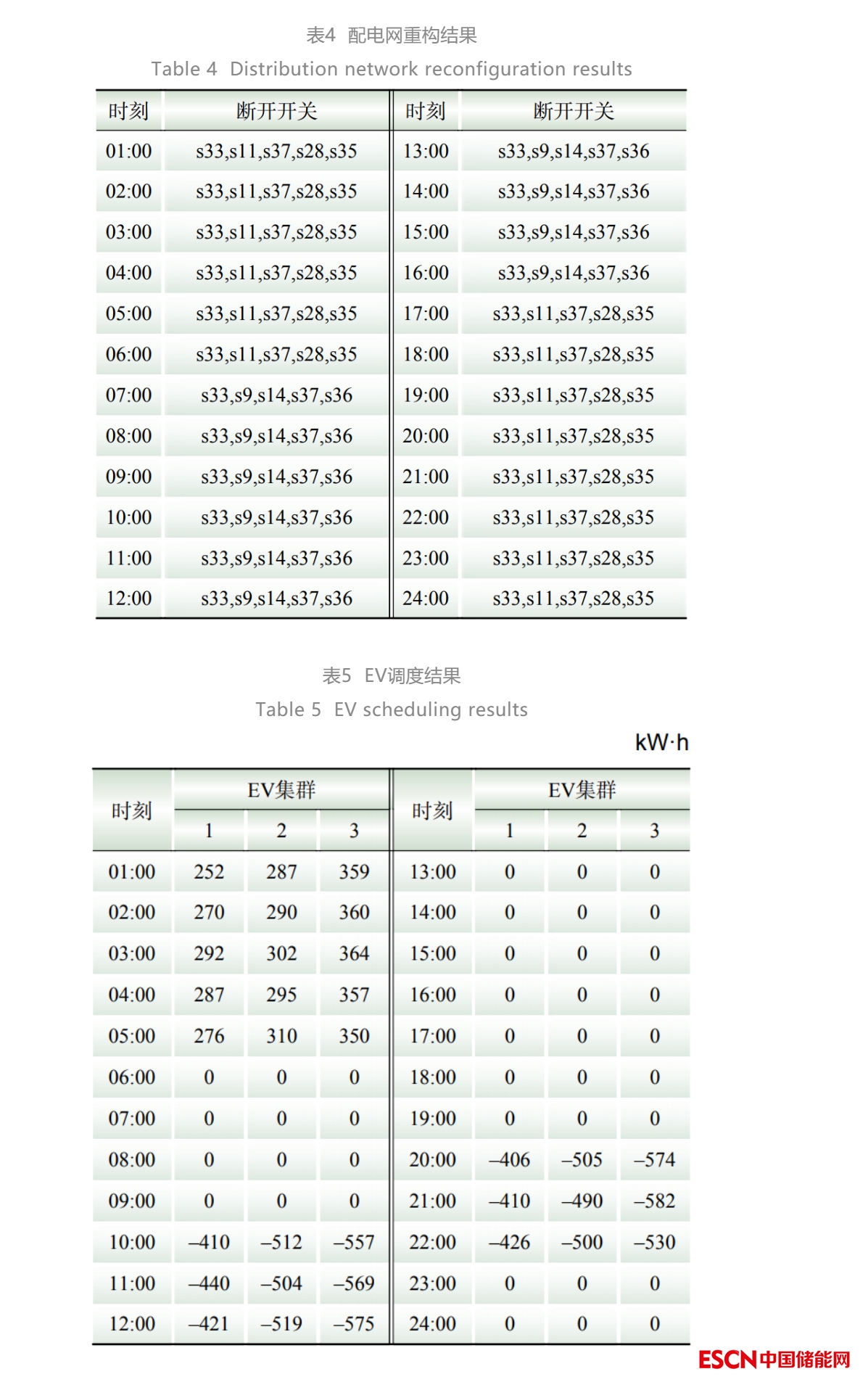 在DG和EV的基礎(chǔ)上,網(wǎng)絡(luò)拓?fù)浣Y(jié)構(gòu)的重構(gòu)結(jié)果如表4所示。在表4中,s表示開關(guān),同時除表中顯示的開關(guān)斷開外,其余線路上的開關(guān)都處于閉合狀態(tài)。EV調(diào)度結(jié)果如表5所示。由表5可知,EV在夜間負(fù)荷低谷期01:00—05:00時段內(nèi)充電,在負(fù)荷高峰時期的10:00—12:00、20:00—22:00時段內(nèi)放電,從而獲得更高的收益。