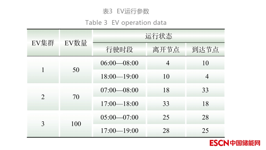 假設(shè)放電價格與充電價格一致,EV放電的單位電量補(bǔ)償價格為0.5元/(kW·h)[20-21]。假設(shè)算例中所有的EV都為同一型號,其具體參數(shù)參考文獻(xiàn)[22]。EV集群中電動汽車車主都是愿意主動參與電網(wǎng)調(diào)度的。EV集群的運(yùn)行數(shù)據(jù)如表3所示。共生生物搜索算法中種群規(guī)模設(shè)置為25[23],最大迭代次數(shù)設(shè)置為100。