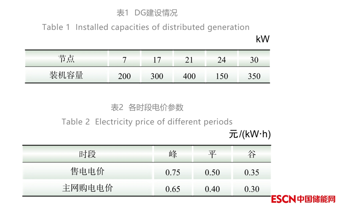 假設(shè)DG為分布式光伏,相關(guān)數(shù)據(jù)如表1所示。在分時電價基礎(chǔ)上,將一天24 h負(fù)荷的變化劃分為負(fù)荷高峰、負(fù)荷平穩(wěn)、負(fù)荷低谷時段,各時段的電價和相關(guān)參數(shù)如表2所示。在表2中,負(fù)荷高峰具體時段為10:00—12:00、20:00—22:00,負(fù)荷平穩(wěn)具體時段位為08:00—09:00、13:00—19:00、23:00—00:00,負(fù)荷低谷具體時段為01:00—07:00。