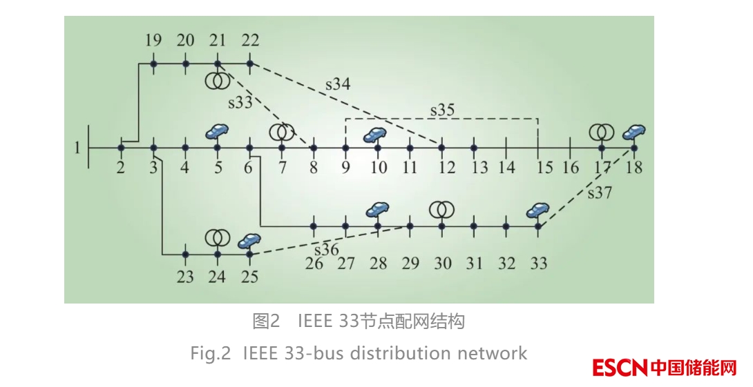 本文采用IEEE 33節(jié)點(diǎn)系統(tǒng)來驗(yàn)證本文所提的考慮DG和EV的配電網(wǎng)絡(luò)重構(gòu)。配電網(wǎng)具體結(jié)構(gòu)如圖2所示。在圖2中,實(shí)線表示線路上安裝有分段開關(guān),虛線表示線路上安裝有聯(lián)絡(luò)開關(guān),設(shè)置線路故障率為0.01[19]。