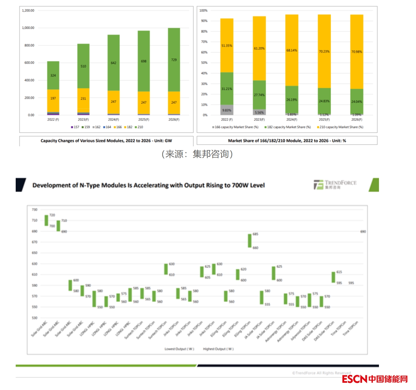 集邦咨詢的《N型技術(shù)發(fā)展趨勢(shì)展望》顯示,2023年大尺寸組件產(chǎn)能繼續(xù)擴(kuò)張,到今年年底,210尺寸組件產(chǎn)能占比達(dá)61.2%。從技術(shù)路線來(lái)看,2023年電池片產(chǎn)能擴(kuò)張以N型為主。N型時(shí)代已經(jīng)到來(lái)。隨著N型組件產(chǎn)品布局的加速,組件功率已然朝著700W邁進(jìn)。