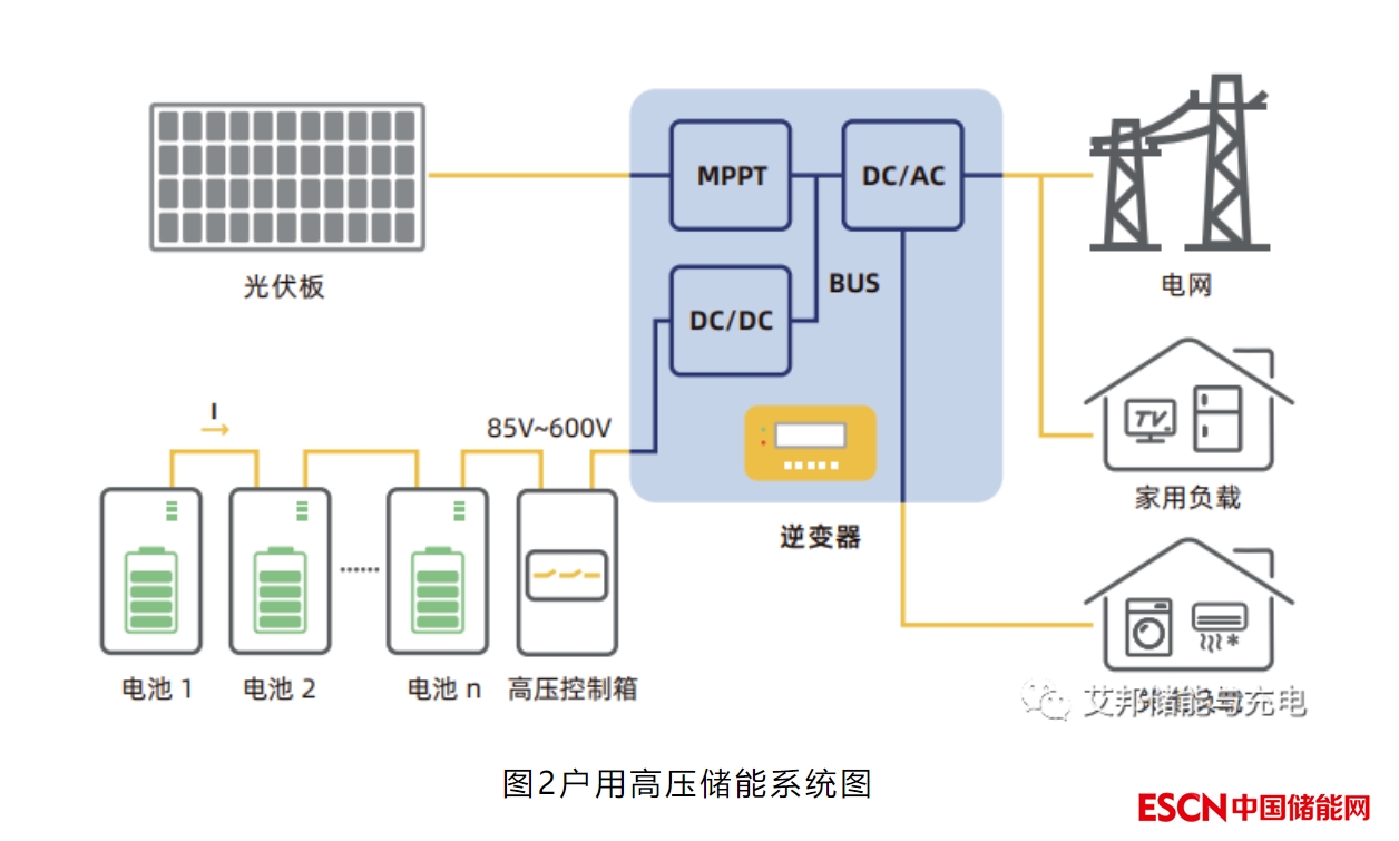 戶用高壓儲能系統(tǒng)電池簇采用兩級架構,由若干個電池模組串聯(lián)經(jīng)高壓控制箱輸出,電壓范圍一般為85~600V,電池簇輸出連接到逆變器,經(jīng)逆變器內(nèi)部DC-DC單元,在母線處與光伏MPPT輸出的直流電交匯耦合,最終通過逆變輸出轉化為交流電并網(wǎng),部分逆變器具備有后備輸出功能。