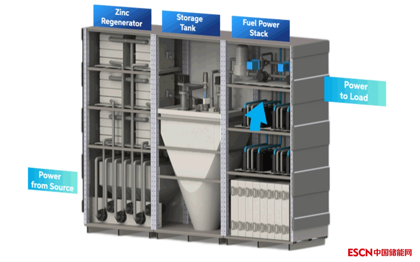 Zinc8開發(fā)了使用鋅和空氣作為反應介質(zhì)的創(chuàng)新電池技術。如下圖所示,鋅金屬微顆粒儲存在中間儲液罐的氫氧化鉀溶液里,放電時將其泵入到右邊的氧化裝置里,與空氣發(fā)生反應產(chǎn)生電流。生成的氧化鋅回到中間液罐進行儲存,當充電時泵入到左側(cè)的還原裝置內(nèi),將氧化鋅電解成氧氣與鋅金屬微顆粒。如此反復進行充放電。