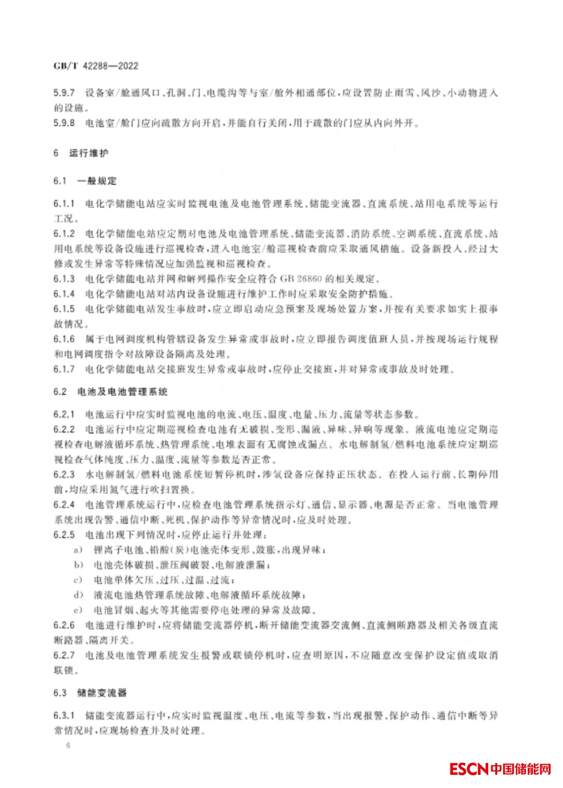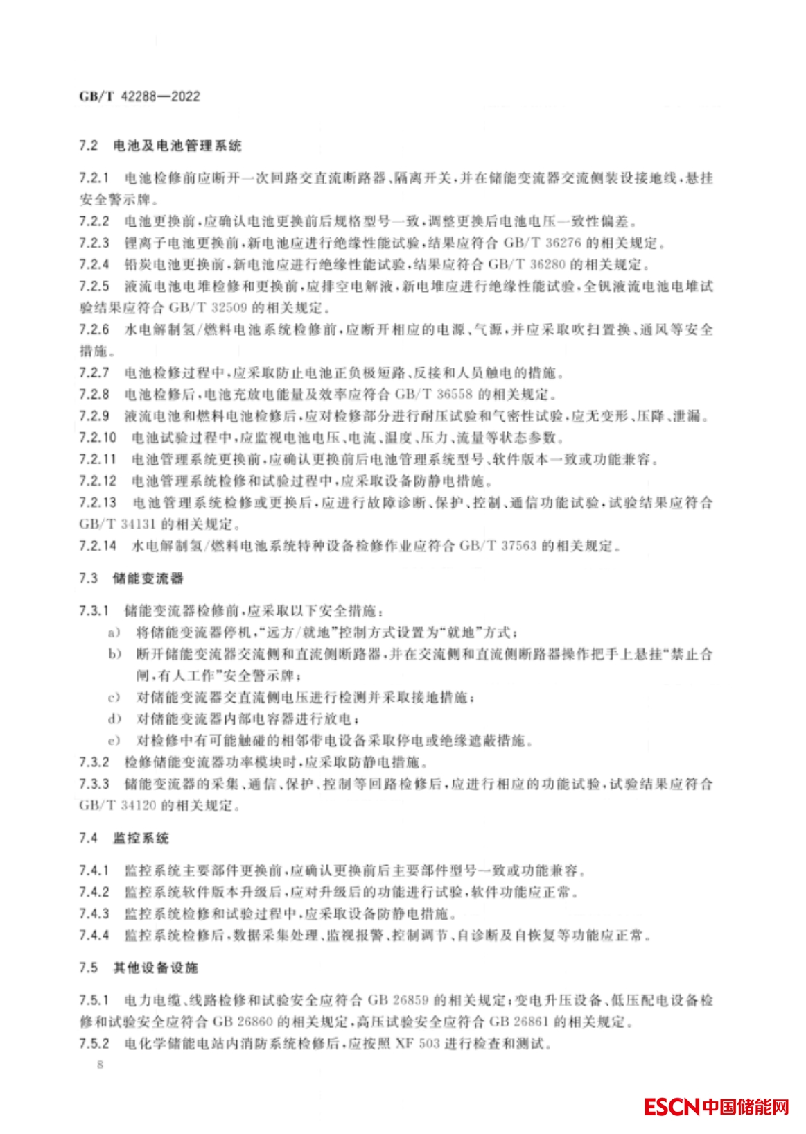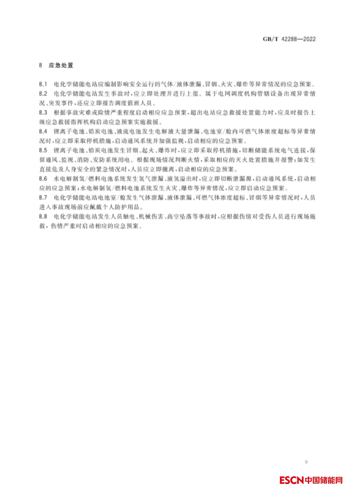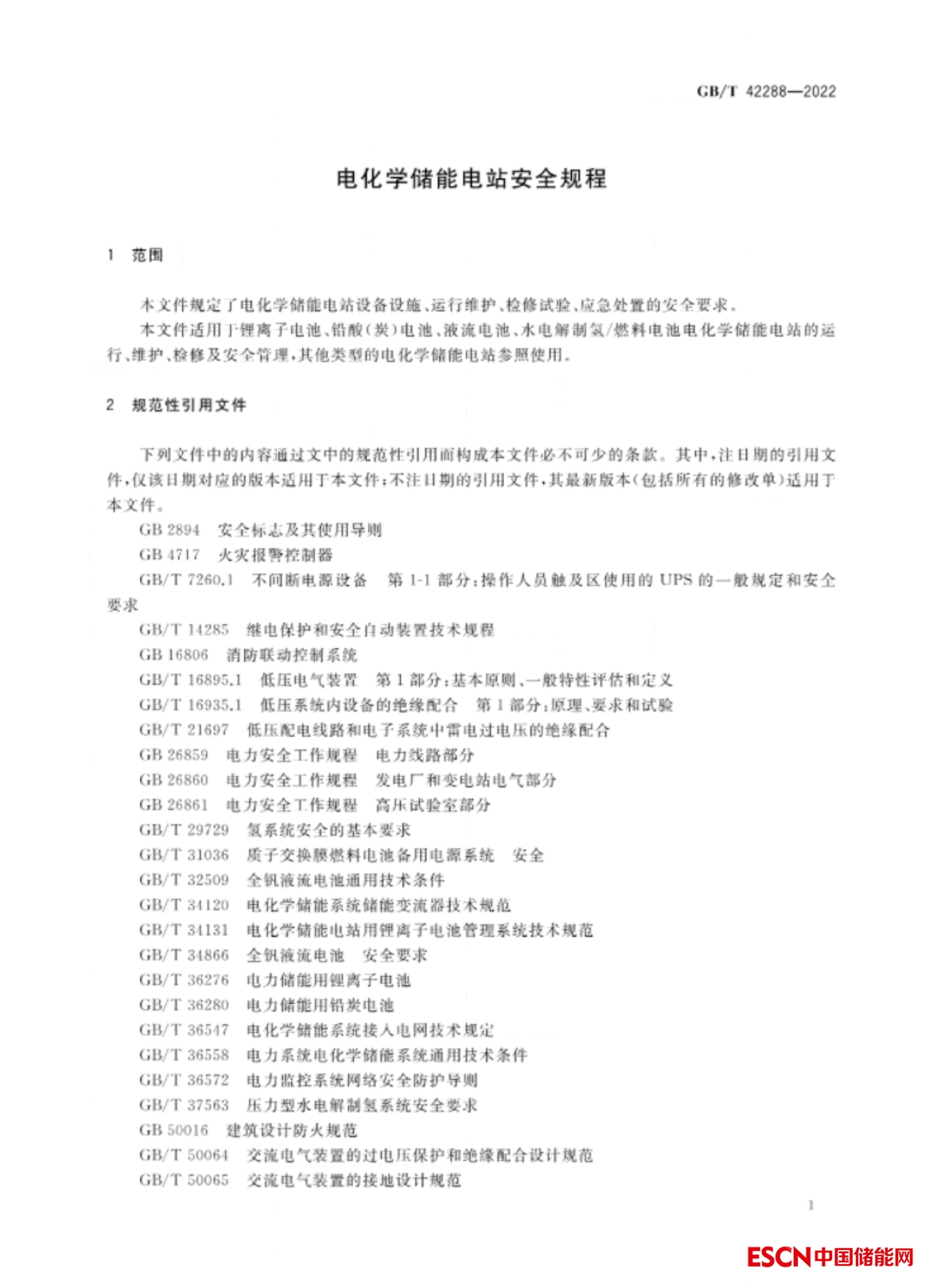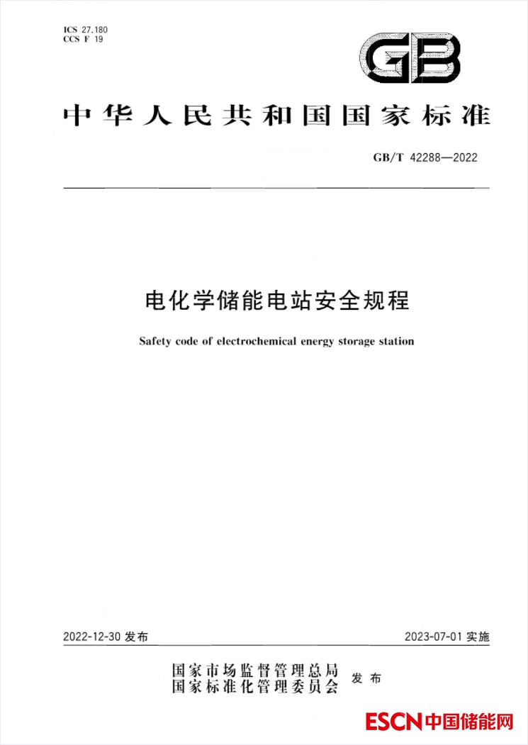 中國儲能網(wǎng)訊:近日,全國標(biāo)準(zhǔn)信息公共服務(wù)平臺發(fā)布了國家標(biāo)準(zhǔn)《電化學(xué)儲能電站安全規(guī)程》全文,該標(biāo)準(zhǔn)將于2023年7月1日正式實施 。該項國家標(biāo)準(zhǔn)針對電化學(xué)儲能電站的設(shè)備設(shè)施、運行維護(hù)、檢修試驗、應(yīng)急處置等提出明確的安全要求,適用于鋰離子電池、鉛酸(炭)電池、液流電池、水電解制氫/燃料電池電化學(xué)儲能電站,其他類型的電化學(xué)儲能電站可參照使用。