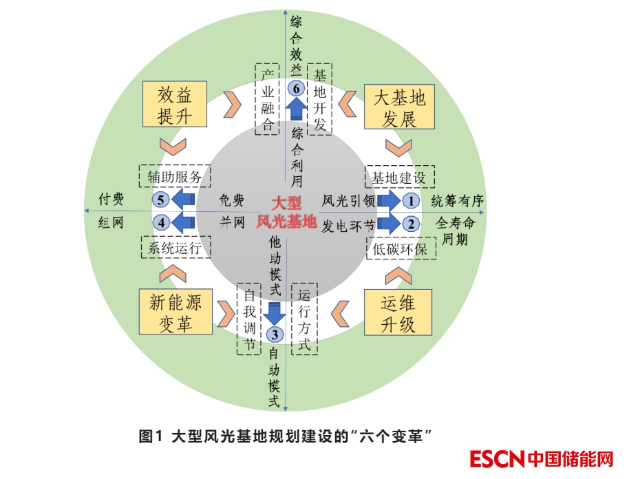 為促進大型風光基地的新能源消納,提升基地建設的綜合效益,本文從大基地發(fā)展、運維升級、新能源變革和效益提升四個方面提出了“六個變革”,如圖1所示。