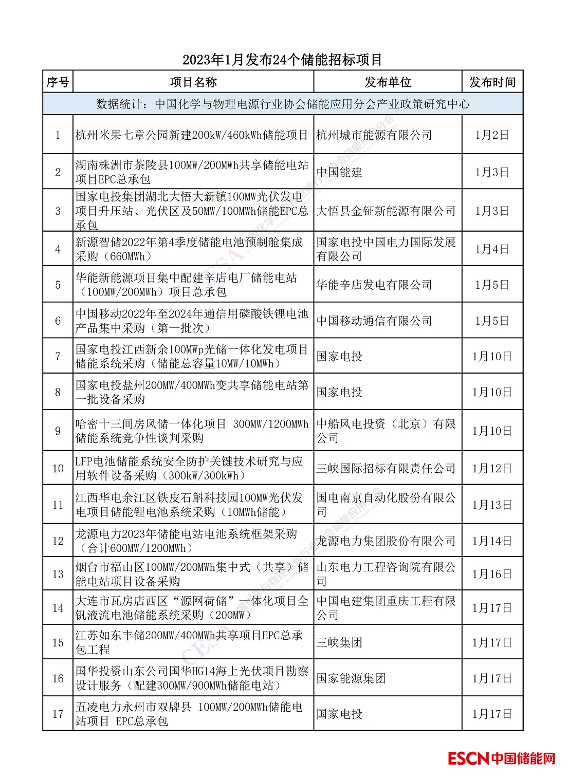中國儲能網(wǎng)訊:據(jù)中國化學(xué)與物理電源行業(yè)協(xié)會儲能應(yīng)用分會(簡稱“CESA")不完全統(tǒng)計(jì),2023年1月發(fā)布24個儲能招標(biāo)項(xiàng)目,儲能容量約為2.98GW/6.93GWh。在政策和資本市場的雙重引擎推動下,新型儲能市場仍然保持高速增長,產(chǎn)業(yè)發(fā)展態(tài)勢良好。