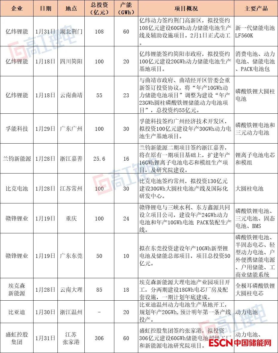 高工鋰電注意到,僅1月份,包括億緯鋰能、孚能科技、蘭鈞新能源、比克電池、贛鋒鋰電、埃克森新能源、比亞迪、盛虹控股集團(tuán)等紛紛宣布擴(kuò)產(chǎn)。涉及動(dòng)力及儲(chǔ)能電池?cái)U(kuò)產(chǎn)規(guī)劃及開(kāi)工項(xiàng)目多達(dá)11起,總產(chǎn)能達(dá)311GWh,投資總額超1000億元。