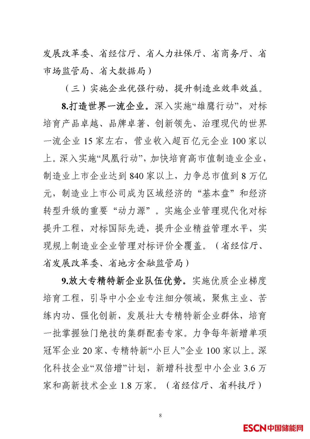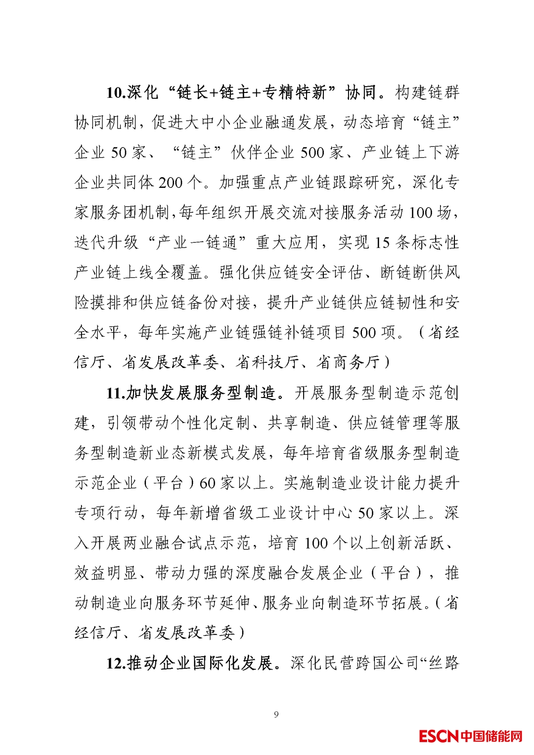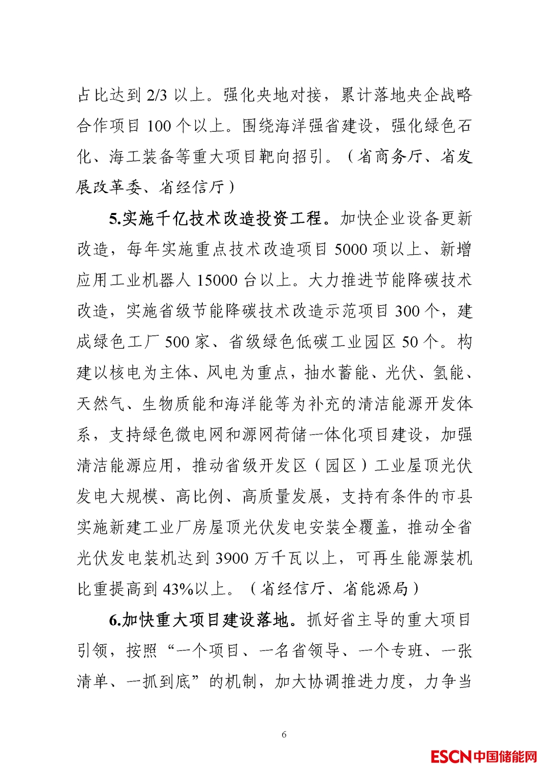 實施千億技術改造投資工程。加快企業(yè)設備更新改造,每年實施重點技術改造項目5000項以上、新增應用工業(yè)機器人15000臺以上。大力推進節(jié)能降碳技術改造,實施省級節(jié)能降碳技術改造示范項目300個,建成綠色工廠500家、省級綠色低碳工業(yè)園區(qū)50個。構建以核電為主體、風電為重點,抽水蓄能、光伏、氫能、天然氣、生物質能和海洋能等為補充的清潔能源開發(fā)體系,支持綠色微電網和源網荷儲一體化項目建設,加強清潔能源應用,推動省級開發(fā)區(qū)(園區(qū))工業(yè)屋頂光伏發(fā)電大規(guī)模、高比例、高質量發(fā)展,支持有條件的市縣實施新建工業(yè)廠房屋頂光伏發(fā)電安裝全覆蓋,推動全省光伏發(fā)電裝機達到 3900 萬千瓦以上,可再生能源裝機比重提高到 43%以上。
