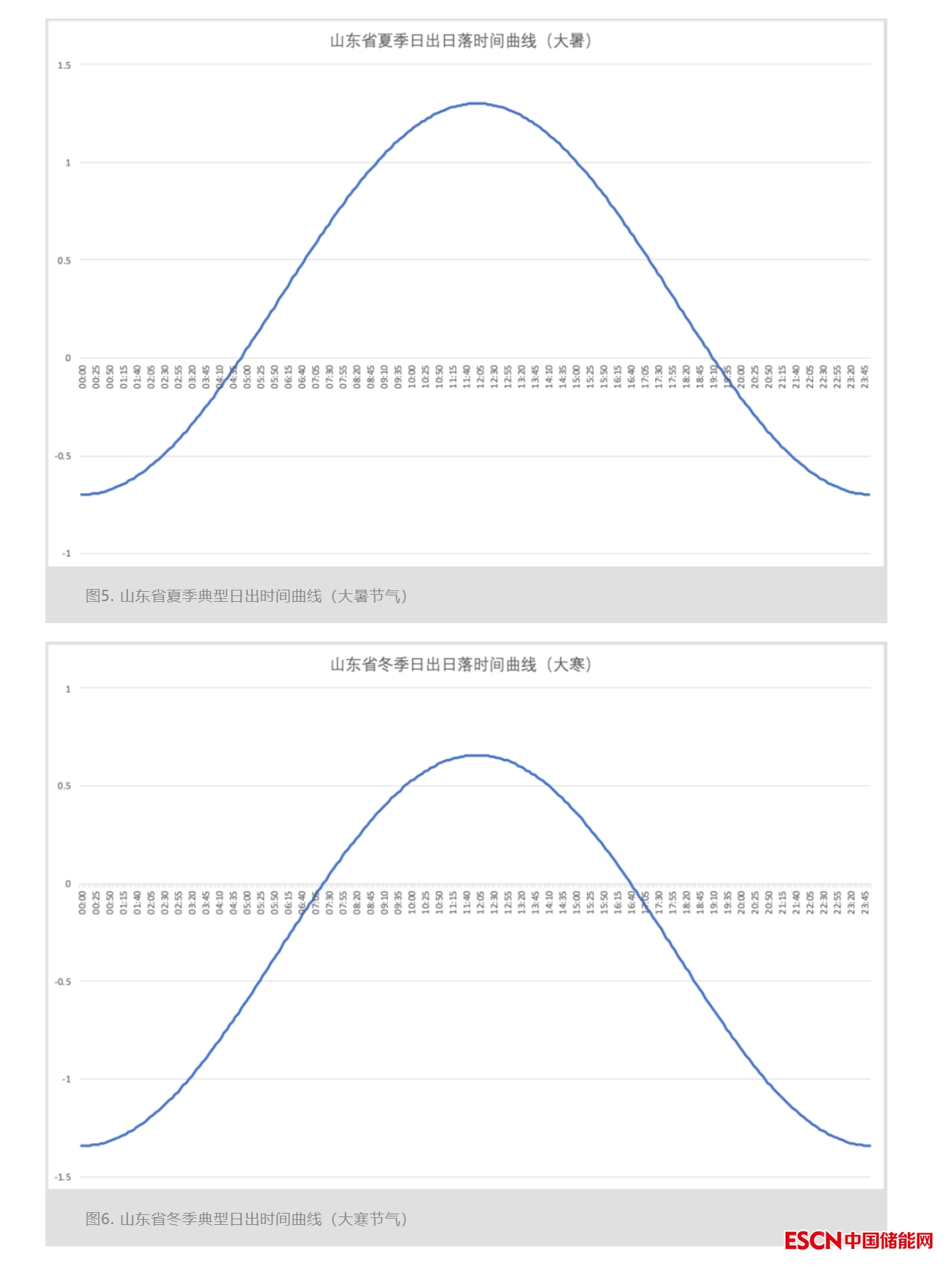 結(jié)合下圖5,6,根據(jù)山東省典型的日出日落時間(北緯37°),對于光伏出力的高峰期,電價信號都給出了明確的指示(如圖2,4),可見光伏發(fā)電的比例對于山東電網(wǎng)的影響已經(jīng)達到了較高的水平。
