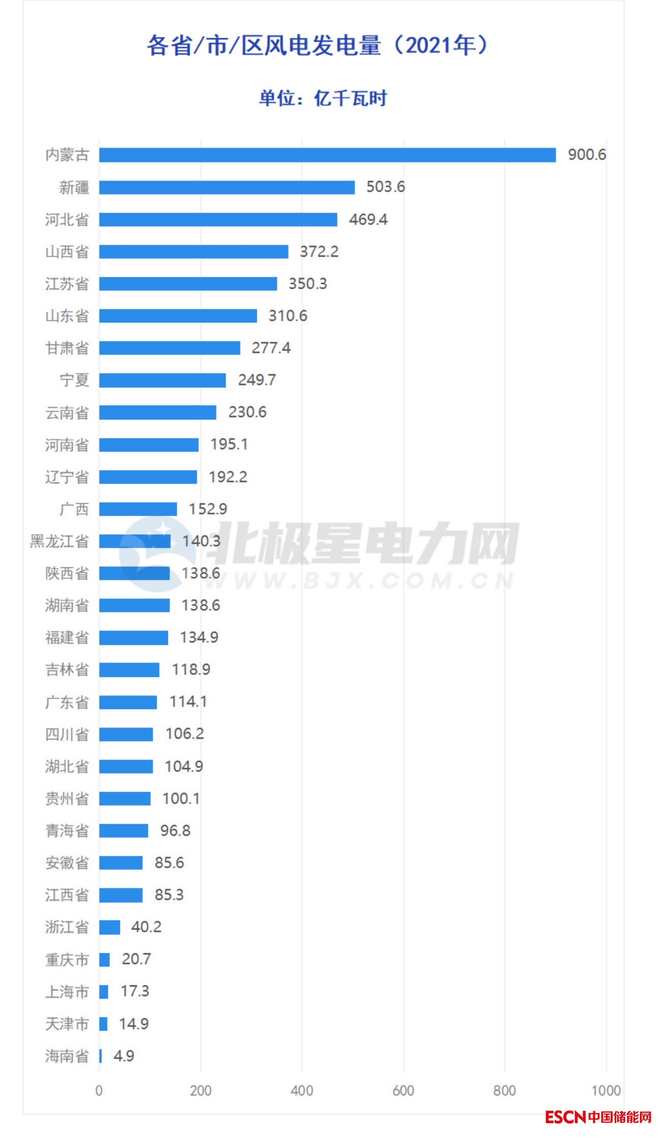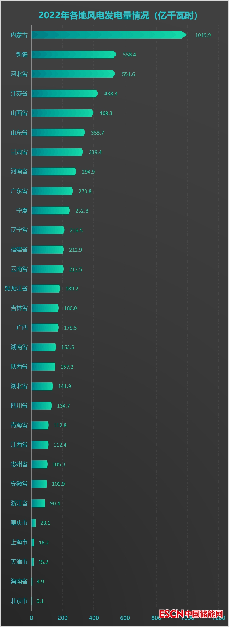 中國儲能網(wǎng)訊:2022年,風(fēng)電發(fā)電量排名TOP5的地方分別是:內(nèi)蒙古(1019.9億千瓦時)、新疆(558.4億千瓦時)、河北省(551.6億千瓦時)、江蘇省(438.3億千瓦時)、山西?。?08.3億千瓦時)。