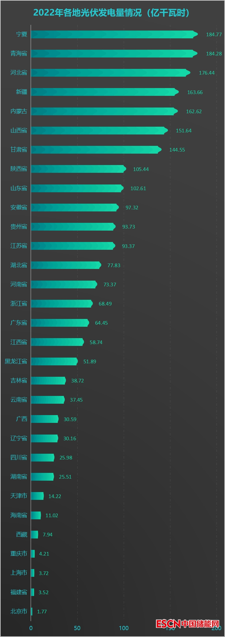 2021年到2022年,寧夏的光伏發(fā)電量從140.32億千瓦時,增長至184.77億千瓦時;光伏發(fā)電量排名也從第四躍升至第一位。